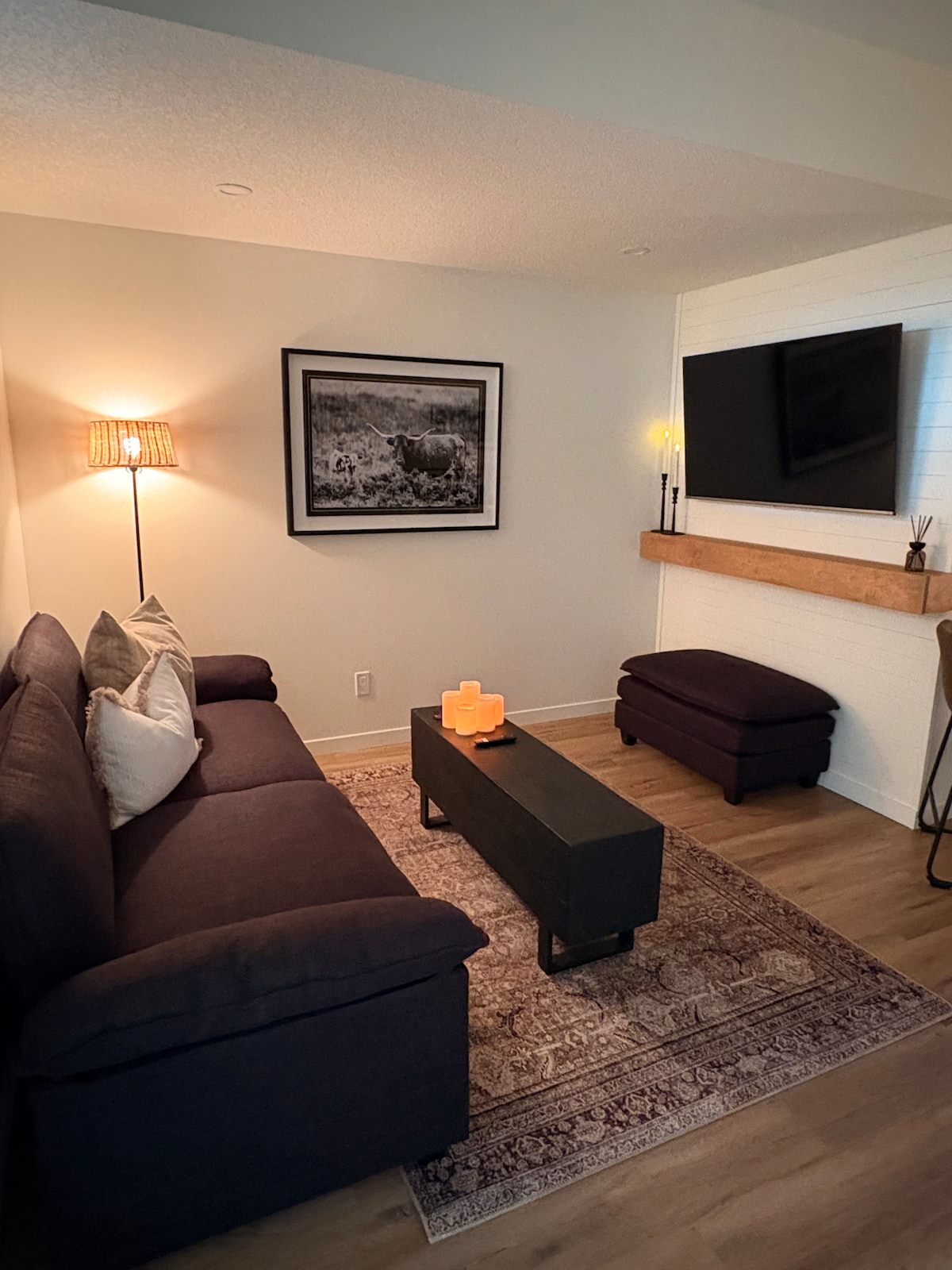 Retreat for couples or friends with fur babies allowed (per night per pet fee). Country town of Diamond Valley, gateway to Kananaskis. Basement suite with separate entrance below busy family home. Queen bed in bedroom & fold out queen in living area. 2 person hot tub room. 2 electric fireplaces. Bluetooth bathroom mirror. Heated bathroom floor. Steam shower. Wet bar & moveable island. Features local artwork, many for purchase. Add on products & services. Exterior & entrance security cameras