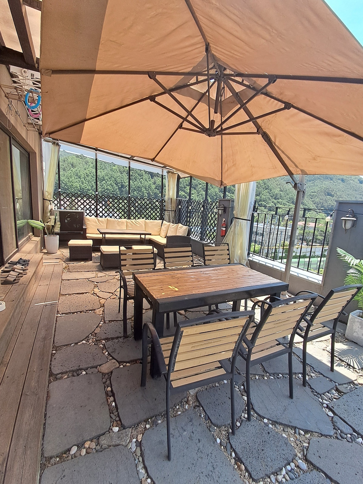 서나와 할아버지 통나무집_햇님에 오신걸 환영합니다. 햇님의 주제는 두가지에요. 첫째는 "공작산 바라기"랍니다. 한국 백대 명산의 하나라는 공작산과 그 위의 하늘을 방안에서 마주 보고 싶어서 벽을 사선으로 깍아 만들었어요. 둘째는 "숨, 쉼"이에요. 머무시는 분들의 몸과 마음이 편안히 숨, 쉼 하실 수 있길 바라는 마음으로 방안을 아무런 칠을 안하고 편백나무로 마감했어요. 또 막지 않을 수 있는 곳은 최대한 막지 않아서 최대한 넓은 느낌, 어디든 다 통하는 느낌을 자아내고자 했어요. 햇님은 이런 주제로 씽크대 하부장과 탁자 세트를 빼고는 모두 서나 아빠가 직접 만든 집이랍니다. 햇님의 자랑인 전망창이나 데크에 편안히 자리잡으시면 공작산과 그 위 하늘에서 펼쳐지는 구름과 바람의 춤을 즐기실 수 있을 거에요. 새들과 풀벌레가 조잘 거리는 소리와 가만히 귀 기울이면 들리는 길 건너 냇물 소리도 맘을 편하게 해드릴 거구요.