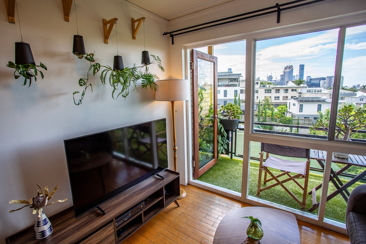 Welcome to your urban oasis! This studio features a rooftop private garden terrace with hinterland views. Enjoy the open-plan design with floor-to-ceiling windows, a kitchenette, dining, lounge & bedroom space. Perfect for work or relaxation, yoga or small gatherings. Has a study table & large dining table. Ideal location to Southbank, The Gabba, QPAC, Riverstage, Suncorp Stadium & the Convention Centre. Includes a 55" smart TV + free Netflix & free car parking. A perfect city retreat!