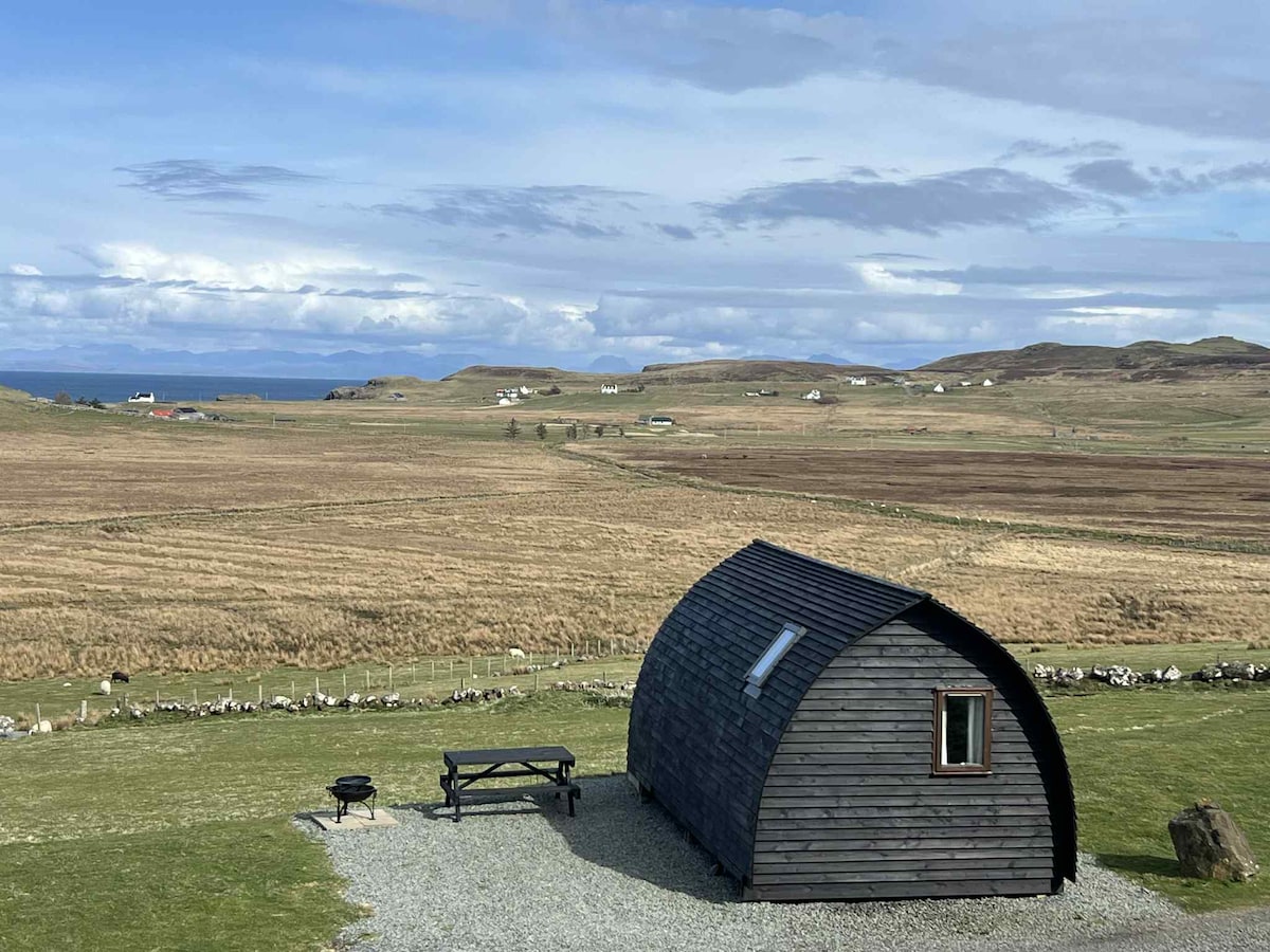 Gael is a modern cabin on a working croft, which captures uninterrupted views over Portree bay, Ben Tianavaig and the Cuillin hills in the far distance. The cabin itself has a full height atrium which includes a functional kitchenette, seating area, log-burner and a three-piece bathroom suite. The mezzanine level is accessed by a wooden staircase featuring a comfortable double bed. Situated just off the Scorrybreach trail this is the perfect launchpad for your Skye adventure.