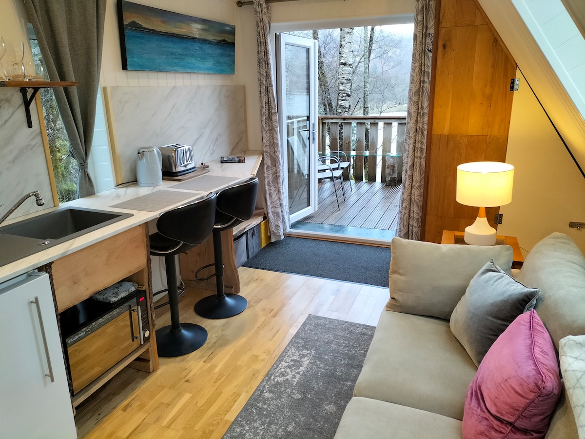 NO ANIMALS , The Hidden Gem is situated next door to our home Archwood lodge as seen on series 5 Scotlands Homes of the Year. A stunning new self catering chalet that can accommodate 4 people, set in thee most amazing hideaway location with panoramic views of Ben Nevis and the surrounding mountains, very easy access to Nevis Range for those who love skiing, hill walking and mountain biking. Private parking, fast internet, decking to relax on and take in the views, sheltered outdoor seating.