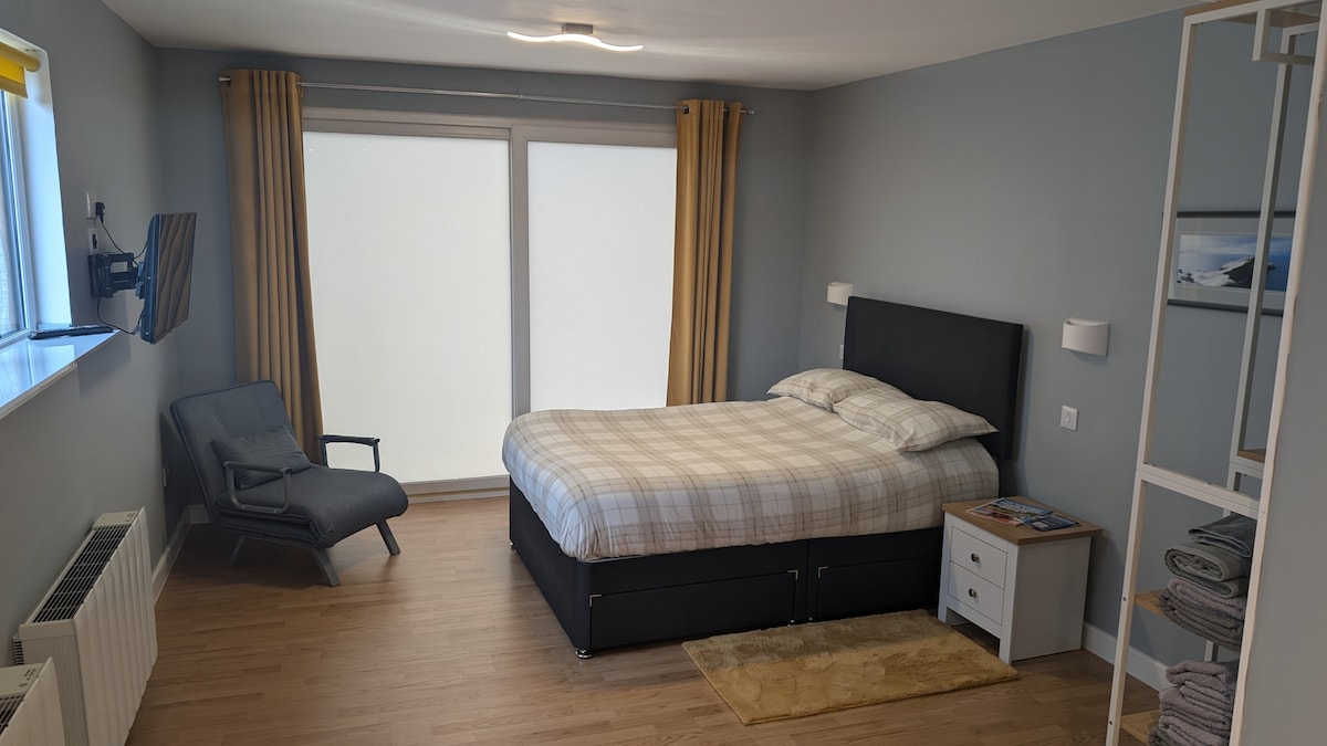 Built in 2023 and finished to a high standard, enjoy a stylish experience at this centrally-located one bedroom private guest space. Located in the Royal Burgh of Tain, off the A9 & NC500 route, this well equipped space is situated in a family garden with off road parking. The self contained building boasts, a double (UK standard) bedroom, shower room and kitchen/diner/sitting area. Large patio doors lead out to the decked area in the garden. 35 miles north of Highland capital Inverness.