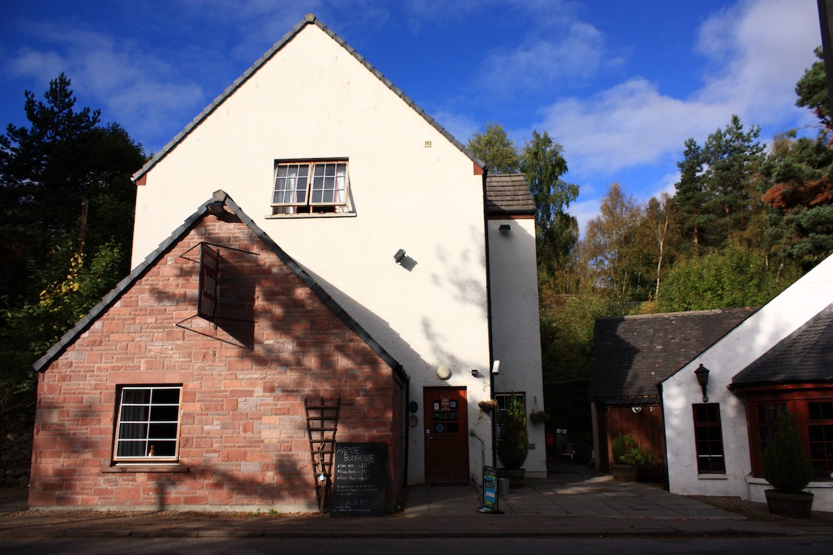 Private room in a hostel. Kitchen, bathrooms and common areas shared with other guests. Located across from the train station and only a few minutes walk from the distillery. Situated in the former village primary school and school house set in an acre of ground. Surrounded by mountains and Loch Ericht only a few minutes walk away. Hot tub in summer house outside, available to use for a small fee during summer months of June, July and August.