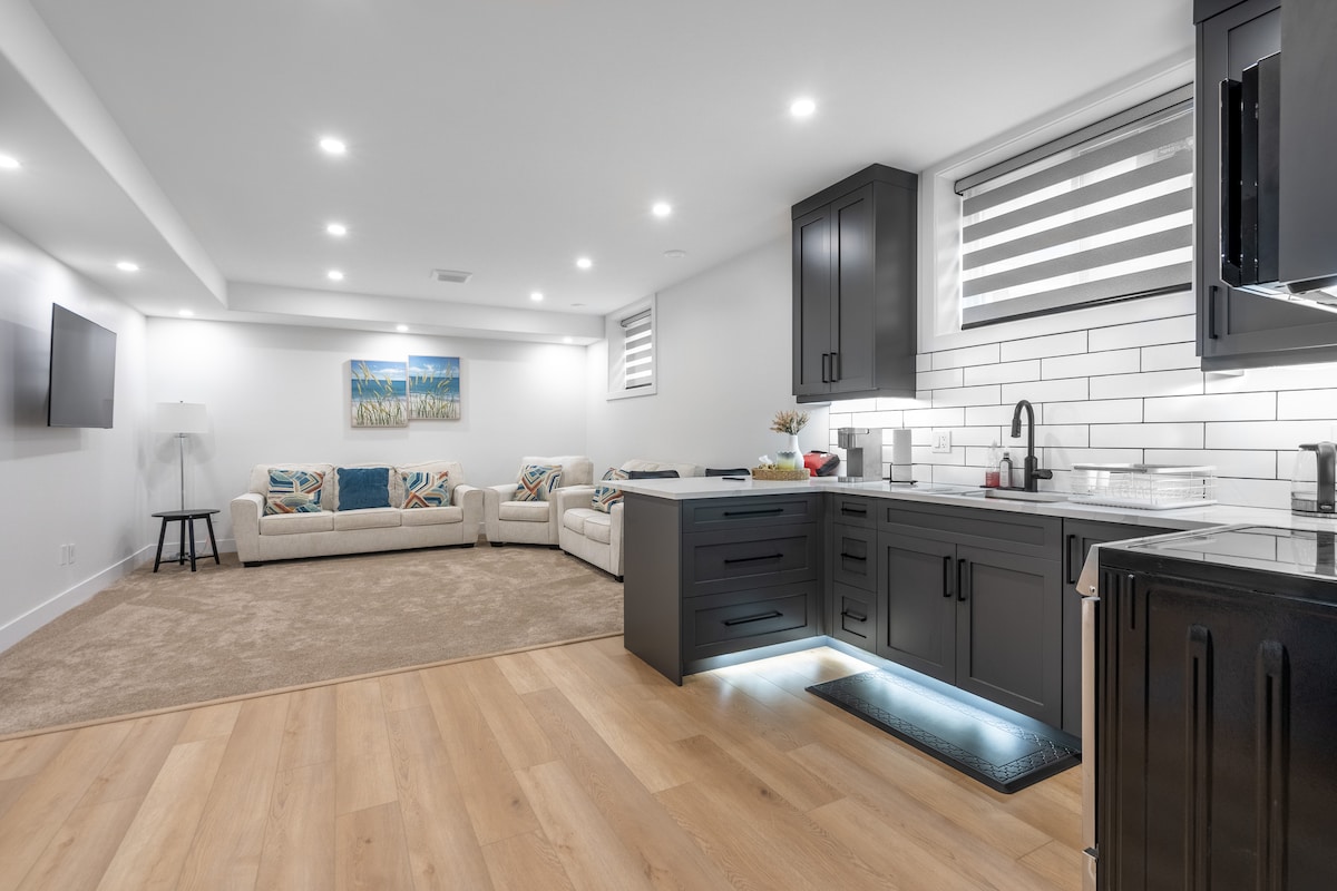 We've recently renovated our basement to create a stylish, modern, cozy and quiet guest suite. There is a side entrance that opens directly onto stairs taking you down to the unit. It has a locking metal exterior door for sound-proofing and security. The unit is a bright studio apartment with three large windows, a full kitchen, sitting area with tv and fireplace, dining table, queen-sized bed, walk-in closet and your own private bathroom with a five-foot shower. With extensive sound-proofing!
