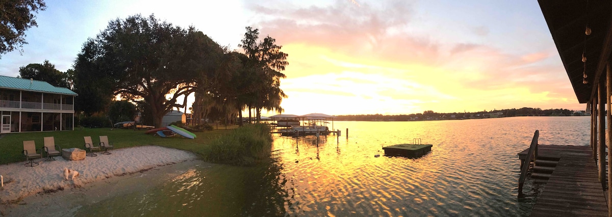 Enjoy the Florida water on this beautiful double lot on Lake Josephine. Bring your boat and tie it up to the dock. Lake Josephine is three lakes all adjoining. Over 5000 square foot home with four bedrooms, sleeping loft, fold out couch, three full baths and one half bath. Easily sleeps 10+. Fully furnished with WIFI, and fully outfitted kitchen and laundry room. We do have a pontoon boat that can be rented separately.