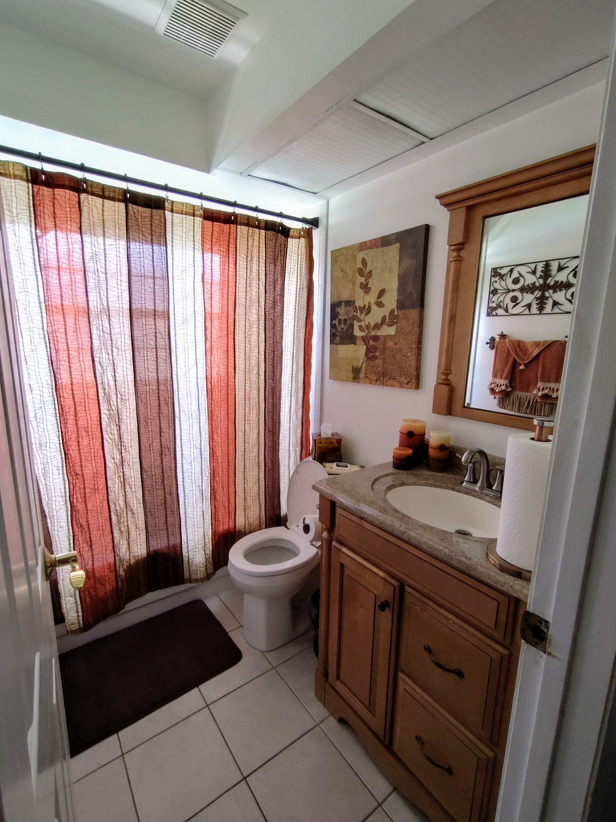 King bed, full bath with shower (The toilet seat is a few inches higher than the norm-ask me and i will explai why), kitchen (No oven) and 1 TV with Netflix and Prime TV on firestick. No local or cable channels. No bedroom TV. It can get very hot in the summer, even with AC. During the day, with AC running full can get as low as 83 degrees. There is a fan to help. If this is an issue, please do not book.