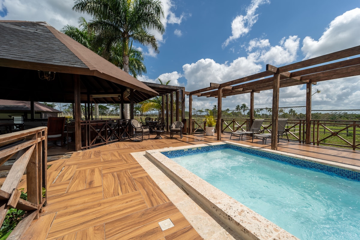 Relájate con toda la familia y amigos en este tranquilo lugar para quedarse. Disfruta de la naturaleza, las montañas, de lagos, ríos, piscina infiniti iluminada y climatizada, así como también de vivir la experiencia con las vacas y de deleitarte con nuestros hermosos caballos de Paso Higueyano. También puedes realizar tus eventos soñados, como bodas, cumpleaños y mucho mas. Estamos ubicados a 1 hora del aeropuerto de Punta Cana, a 15 minutos de Higüey, en la carretera Higüey- Seibo.