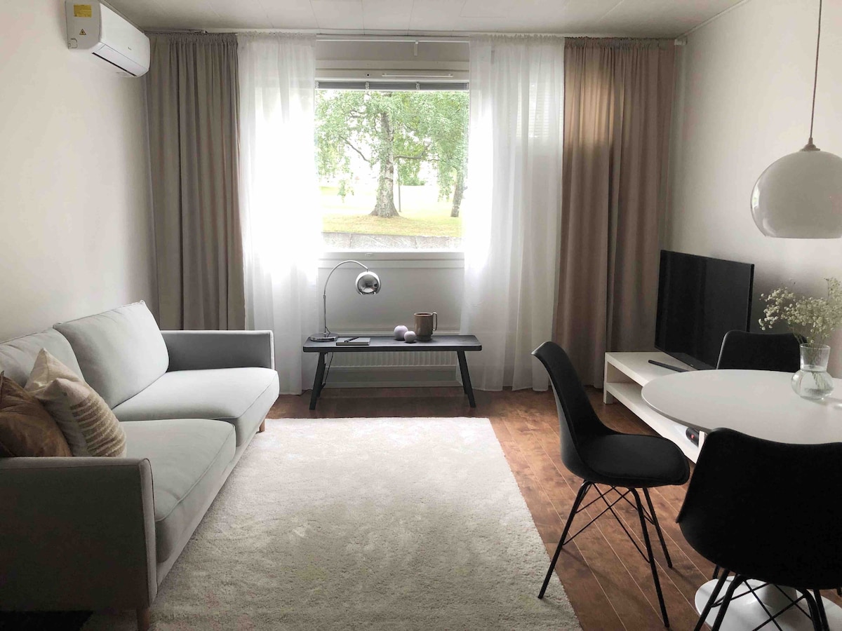 Tässä kauniisti uudistetussa yksiössä on viihtyisä tunnelma. Tori, kaupat ja ravintolat ovat lyhyen kävelymatkan päässä. Alkovissa on laadukas 140 cm leveä runkopatjasänky. Olemme varanneet käyttöösi hygieniatuotteita, valkoiset lakanat ja pyyhkeet. Lisäksi käytössäsi on polkupyörä. Sisustus- ja pintamateriaaleissa on huomioitu niiden sopivuus allergisille, jonka vuoksi lemmikit eivät ole sallittuja. Tervetuloa majoittumaan hyvin työn tai vapaa-ajan puitteissa!