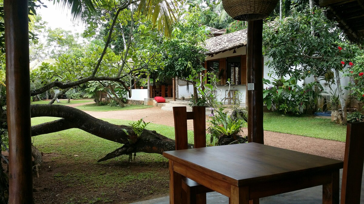 Hi-Speed Fibre Internet for remote workers.....Luxurious home suitable for families with small kids boasting a large tropical garden enjoying country & sunrise views. 3 x Spacious Air Conditioned double bedrooms, a modern indoor kitchen, 2 x bathrooms, an outdoor shower, an open plan living area, and a terrace for Al Fresco dining. The garden is a paradise for nature and wildlife such as monkeys, chipmunks, peacocks and the occasional spider. We are approx 6-8 min walk from Mirissa Beach.