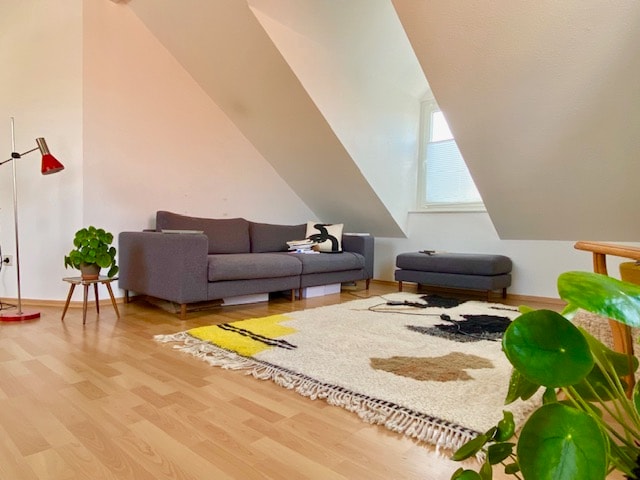 Sehr helle und ruhige Dachgeschosswohnung mit Einbauküche/Geschirrspüler, Tageslicht-Bad mit Badewanne, Dusche, WC, Bidet, Waschtisch, Schlafnische im Zwerchhaus, Zimmer mit großen Dachfenstern und traumhaftem, kilometerweitem Blick Richtung Westen. Extrem komfortable Sitzmöbel, Stereo-Anlage, Kabelradio u. -fernsehen, Kaminofen zusätzlich zur Zentralheizung. Ca. 10 min zu Fuß zum Ostbahnhof, ca. 15 min zur Fußgängerzone, ca. 5 min zum Naherholungsgebiet. Abschließbarer Fahrradschuppen.