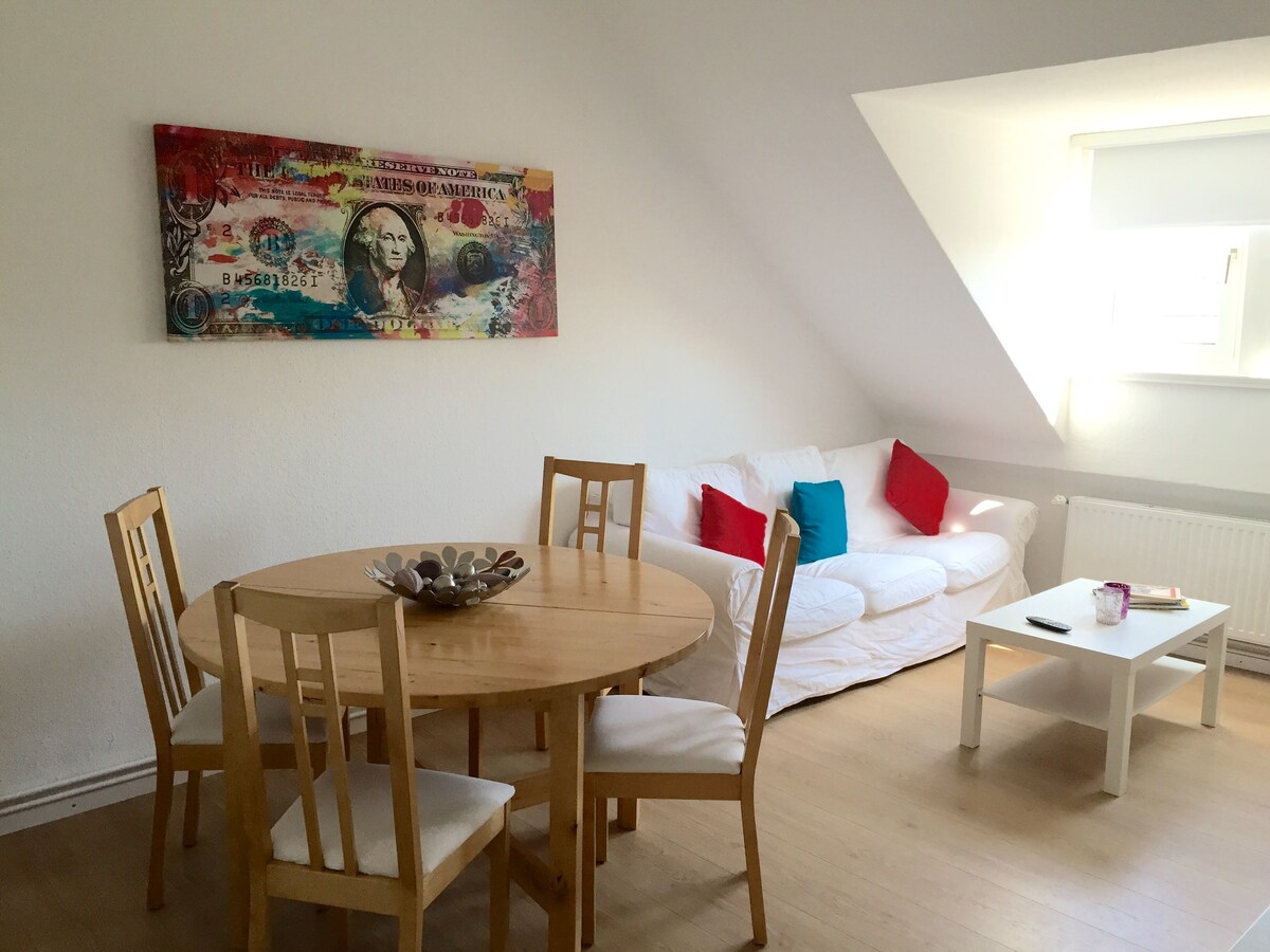 Sehr helle und ruhige Dachgeschosswohnung mit Einbauküche/Geschirrspüler, Tageslicht-Bad mit Badewanne, Dusche, WC, Bidet, Waschtisch, Schlafnische im Zwerchhaus, Zimmer mit großen Dachfenstern und traumhaftem, kilometerweitem Blick Richtung Westen. Extrem komfortable Sitzmöbel, Stereo-Anlage, Kabelradio u. -fernsehen, Kaminofen zusätzlich zur Zentralheizung. Ca. 10 min zu Fuß zum Ostbahnhof, ca. 15 min zur Fußgängerzone, ca. 5 min zum Naherholungsgebiet. Abschließbarer Fahrradschuppen.