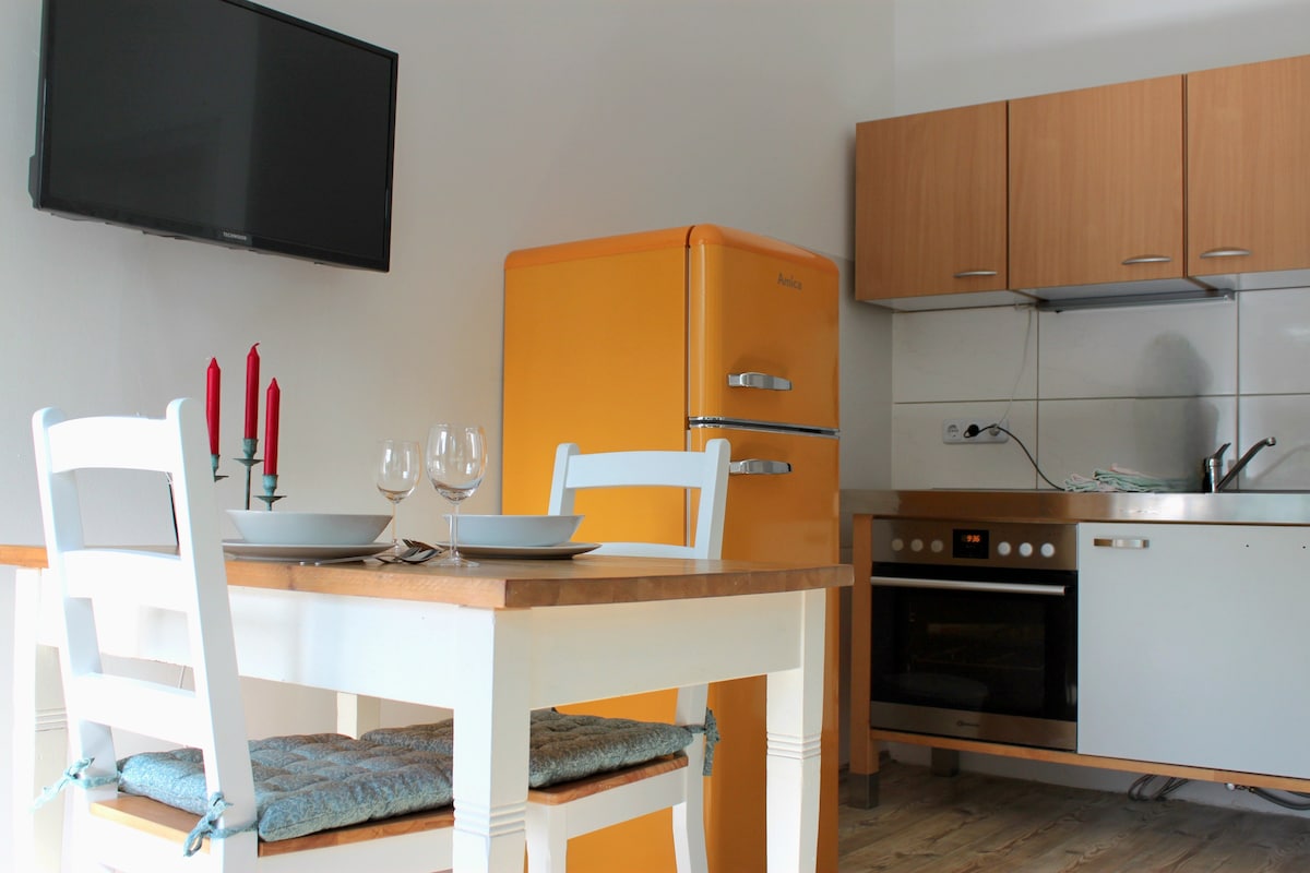 Die Wohnung besitzt einen separaten Eingang, eine eigene Küche die mit allem ausgestattet ist um sich kleinere Mahlzeiten zuzubereiten. Das Tageslichtbadezimmer ist mit einer Dusche, einem WC sowie einem Waschbecken ausgestattet. Die Waschmaschine ist dort auch aufzufinden. Der Wohnbereich bietet eine Essecke, schränke zum aufbewahren von Gepäck, sowie eine Schlafcouch und einem Fernseher. WiFi ist selbstverständlich auch verfügbar. Insgesamt ca. 40m2 Wohnraum.