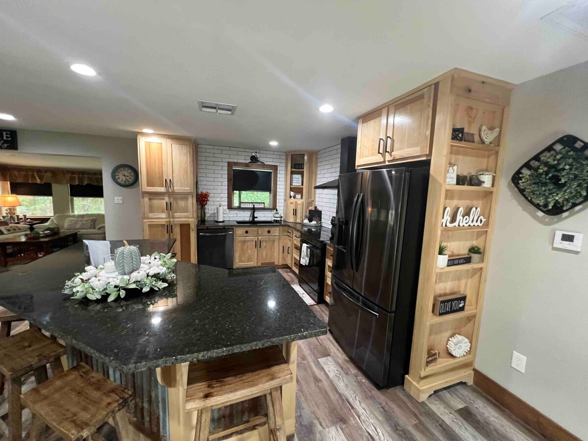 Take a break and unwind at this peaceful home. Walk to the edge of the lake for some great fishing and beautiful sunsets or take a 5-minute drive to the boat launch. This home gives you the opportunity to fish and swim during the day and star gaze at night. A new washer and dryer, an electric fireplace, a comfortable king size bed, and a 75-inch smart TV await. A queen size pull-out couch with Tempur-Pedic mattress is available to accommodate two additional guests. Walk-in shower with dual heads