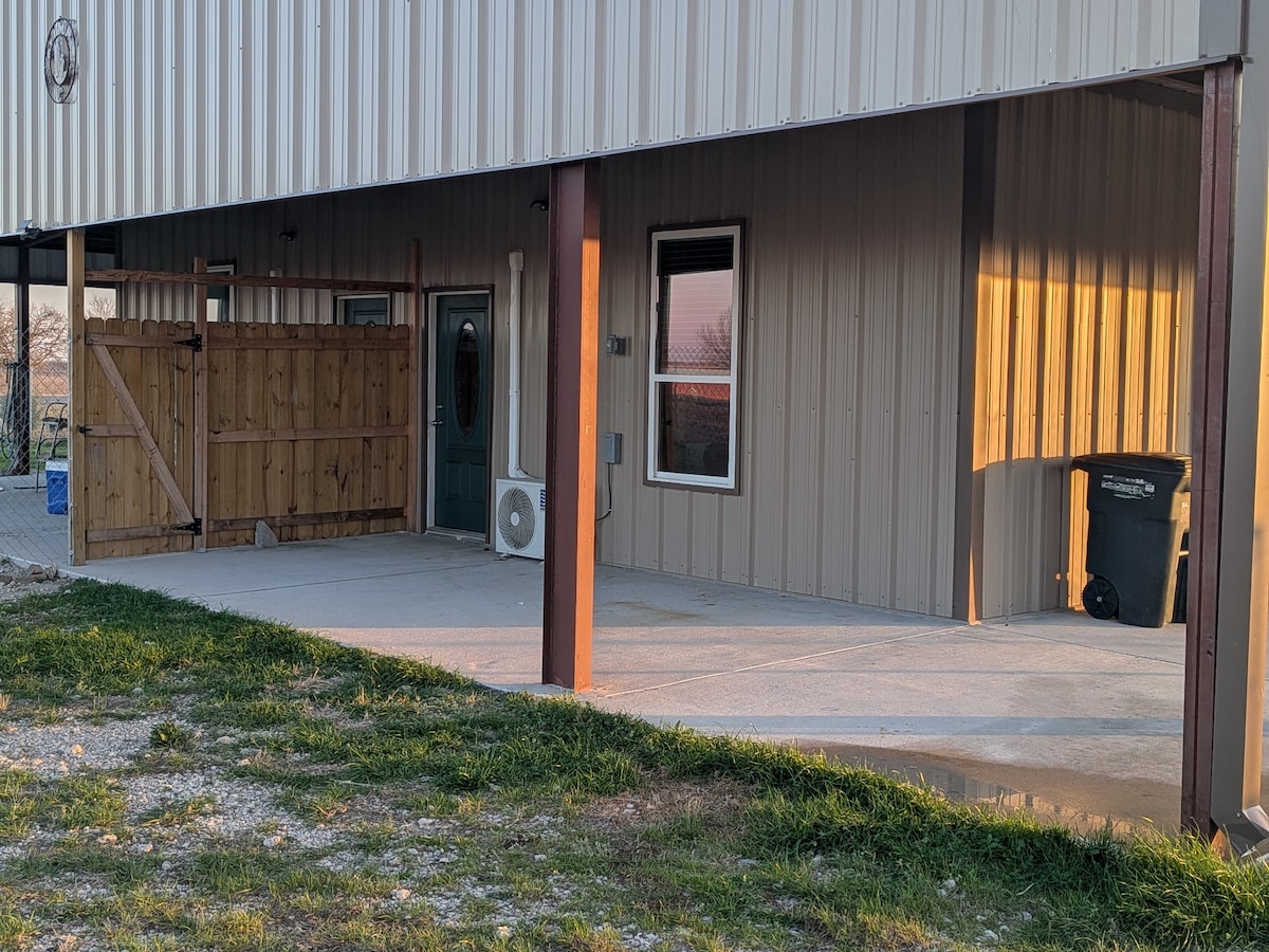 Country cottage studio with queen bed, kitchenette and bathroom with shower. Peaceful setting with wonderful walking paths on working farm. Near Scarborough Fair and Antique Alley. Private cottage, many clearings in the woods suitable for tent camping of children while adults enjoy the cottage! Within an hour of Fort Worth yet remote enough to still see the Milky Way at night. Bring your telescope! Owners grass airstrip under renovation but inquire about using the neighbors.