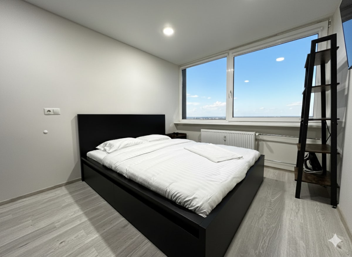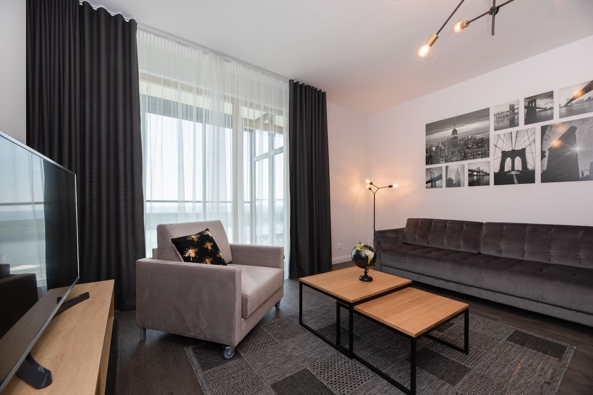 Experience Klaipėda from the 24th floor in this stylish apartment. Wake up to stunning sea views from your private balcony, and enjoy modern comforts like air conditioning, free WiFi, and a fully equipped kitchen. The spacious one-bedroom retreat includes a cozy dining area, flat-screen TV, and a sleek bathroom with linens and towels provided. Just steps away from the Ferry, Akropolis and old town attractions, this tranquil, non-smoking haven is perfect for a relaxing or business getaway.
