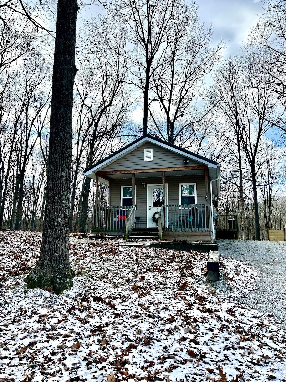 Kick back and relax in this calm, stylish space.This 14x40 cottage is brand new with a front and back porch. The front porch is the whole length of the cabin with 4 rockers to sit in and relax. The back porch has seating that overlooks farmland and you may see an occasional deer grazing in the field. There is a gas grill on the back porch as well. We have a fenced private area with a fire pit and chairs to enjoy a fire on a cool night.