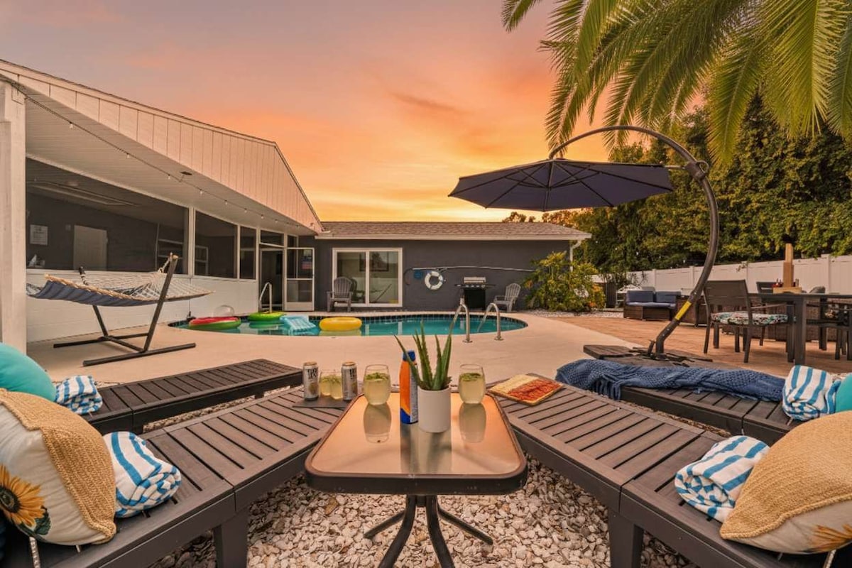 Kick back and relax in this calm, stylish beach-vibin home. The 2 bedroom plus queen size sleeper sofa in sunroom is the perfect spot to get away and never have to leave. Enjoy your morning coffee or afternoon cocktail lounging by the fire pit. Light up the grill and cook your meal while you enjoy a pool heated to 86 degrees for free! Wifi and 3 streaming TV's. If you want to get out and explore, you are only 6 minutes from the award winning beaches and 25 minutes from downtown St Pete.