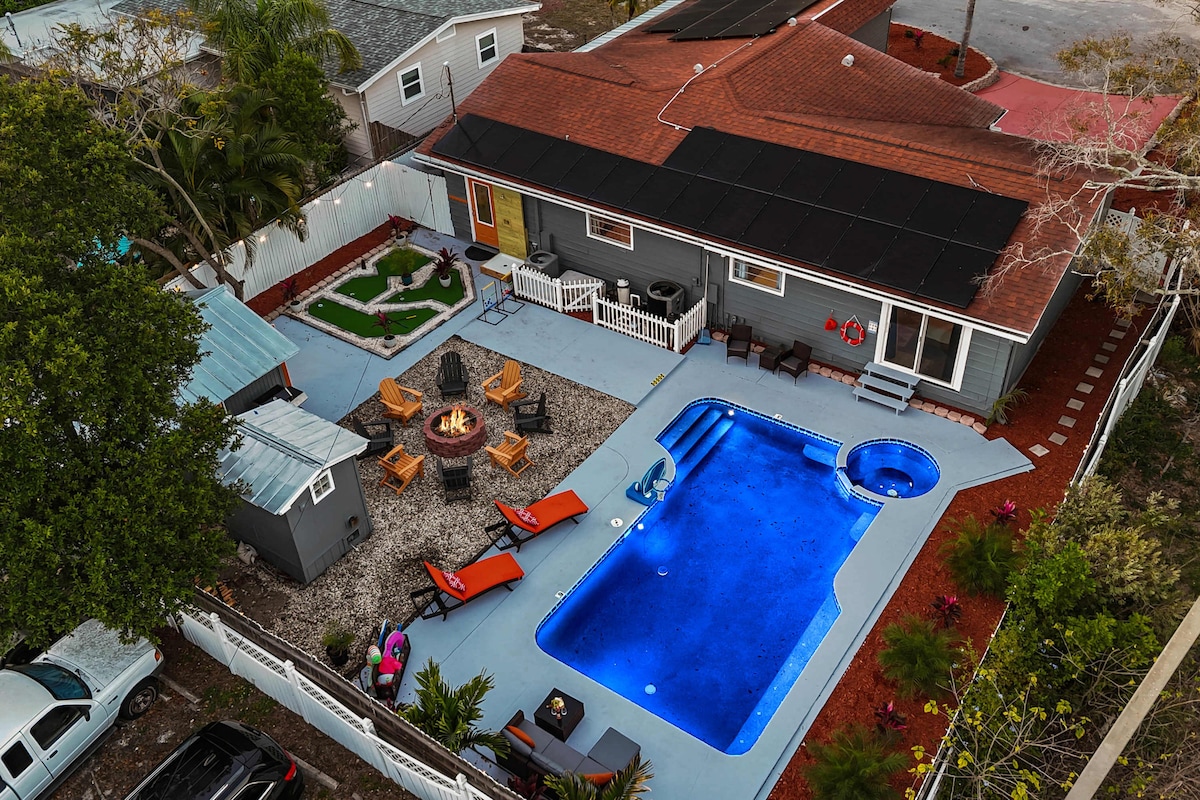 ☀️ Looking for a place the whole family/group can enjoy? This centrally located modern home is full of fun and style, with everything you need—from a fully stocked kitchen 🍽️ to beach supplies ⛱️ and more. Enjoy an Insta-worthy space with 5-hole mini golf, giant outdoor games, a heated pool, arcade & board games, and cozy spaces inside and out. 📍 Just 6 miles to the beach and Downtown St. Pete—perfect for your getaway!