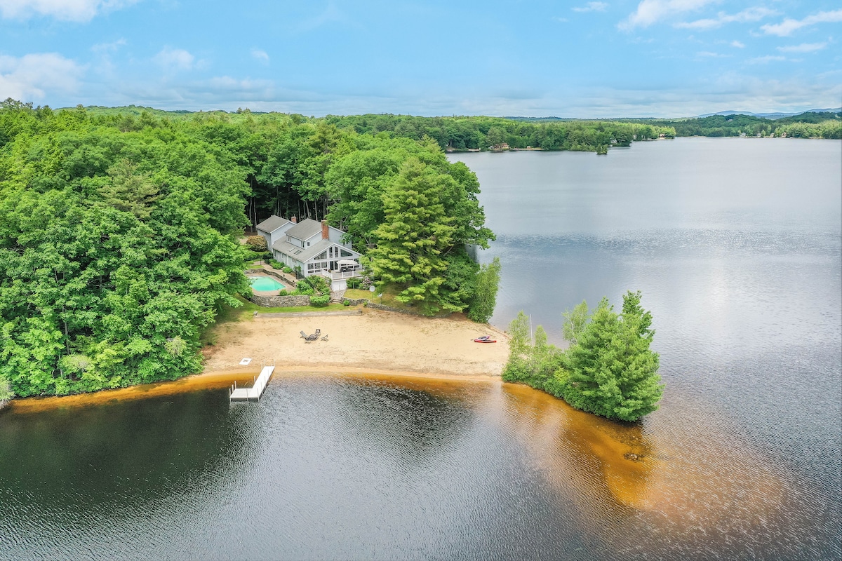 Less than an hour from Manchester, Concord & Keene, this new home offers relaxation & year-round adventure. This lakefront property has a dock, with kayaks & paddleboards. You could also walk down the paved road to the neighborhood beach & swim platform. About 30 minutes to Pats Peak, Sunapee, or Crotched Mtn ski resorts. Beds for 6, 2 full baths, W/D, fully equipped kitchen, open living space, gas fireplace, water views, gas grill, parking, firepit, internet. We do not allow pets or smoking.