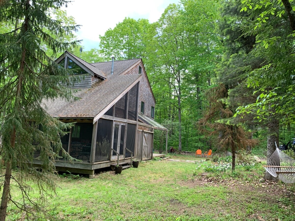 Secluded, tranquil, woodland retreat. Unique home overlooks river-cathedral ceilings and large windows throughout. Stay cozy indoors by the wood stove or explore acres of conservation land abutting the property. All you need for quiet getaway or ski vacation. Sleeps 6 in winter months; extra bed on sleeping porch overlooking river in warmer months. Master bath has deep soaking jacuzzi tub. Skiing 20 minutes away at Pat's Peak & Crotched Mt. Trails nearby for hiking, snowshoeing & x-country.