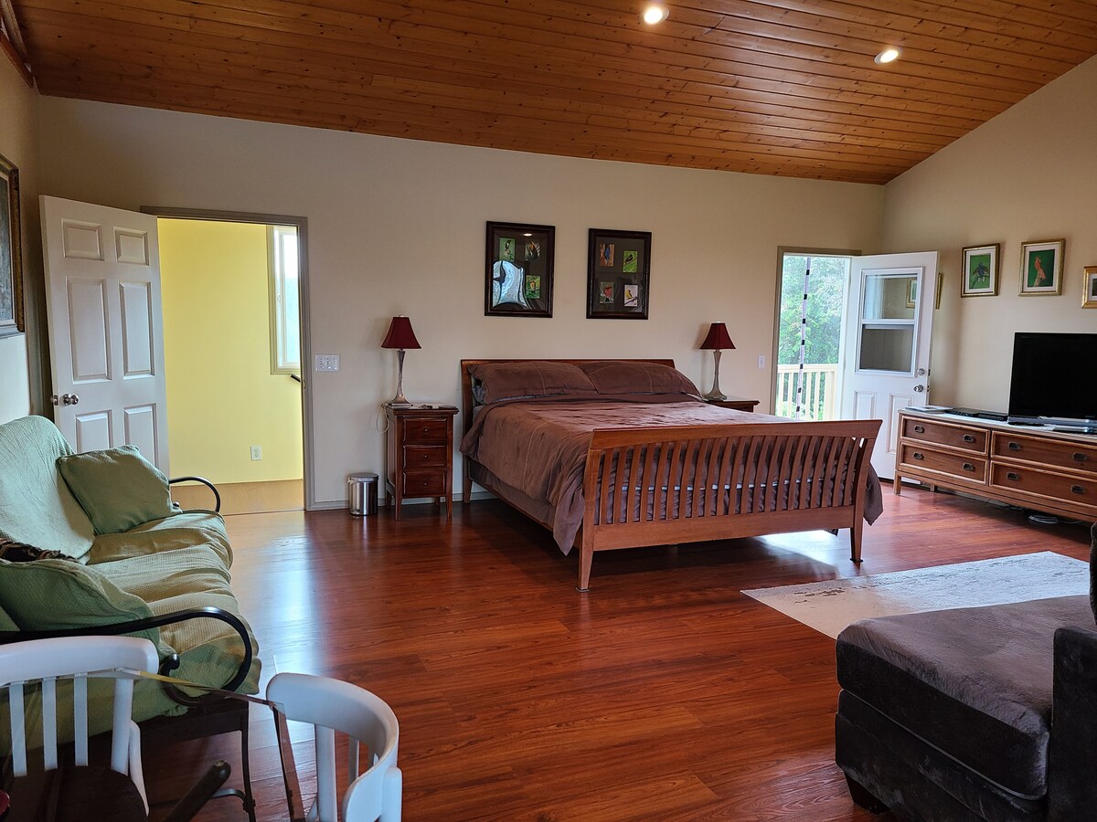 The suite is very spacious (500 sq/ft), located less than one mile to downtown Hilo on a private 1.7 acre property. The house is accented with hardwood floors and tastefully furnished including a queen size bed. The room has a private entrance, private bathroom and private deck overlooking a beautiful valley with a small waterfall. The unit has access to a covered gazebo with a shared BBQ cooking area.