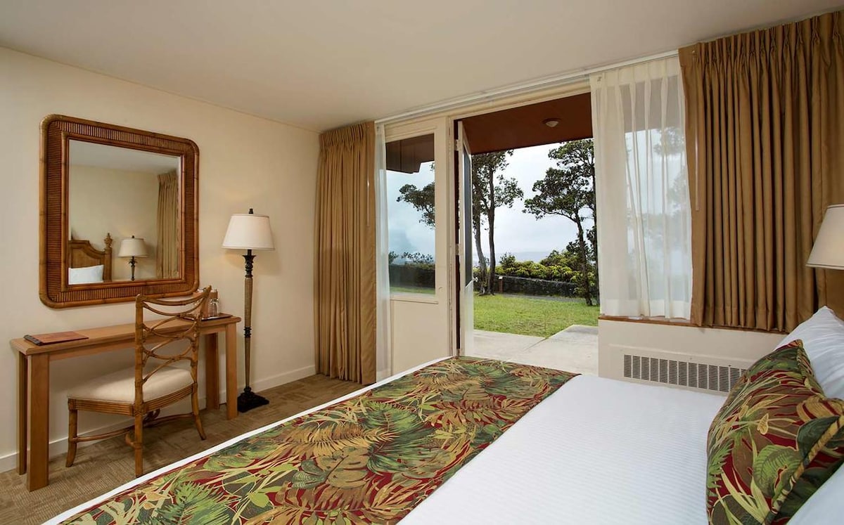 Discover serenity in our Ohia-forest backed rooms—a tranquil haven where private lanais invite you to dine amidst bird songs. Each retreat features a plush 14-inch memory foam mattress and a flat-screen TV. Our courtyard, blending open skies with cozy corners, houses a soothing hot tub. Enjoy the convenience of an in-room coffee maker, microwave, and refrigerator. Just 2.5 miles away lies the majestic Volcanoes National Park, awaiting your exploration.