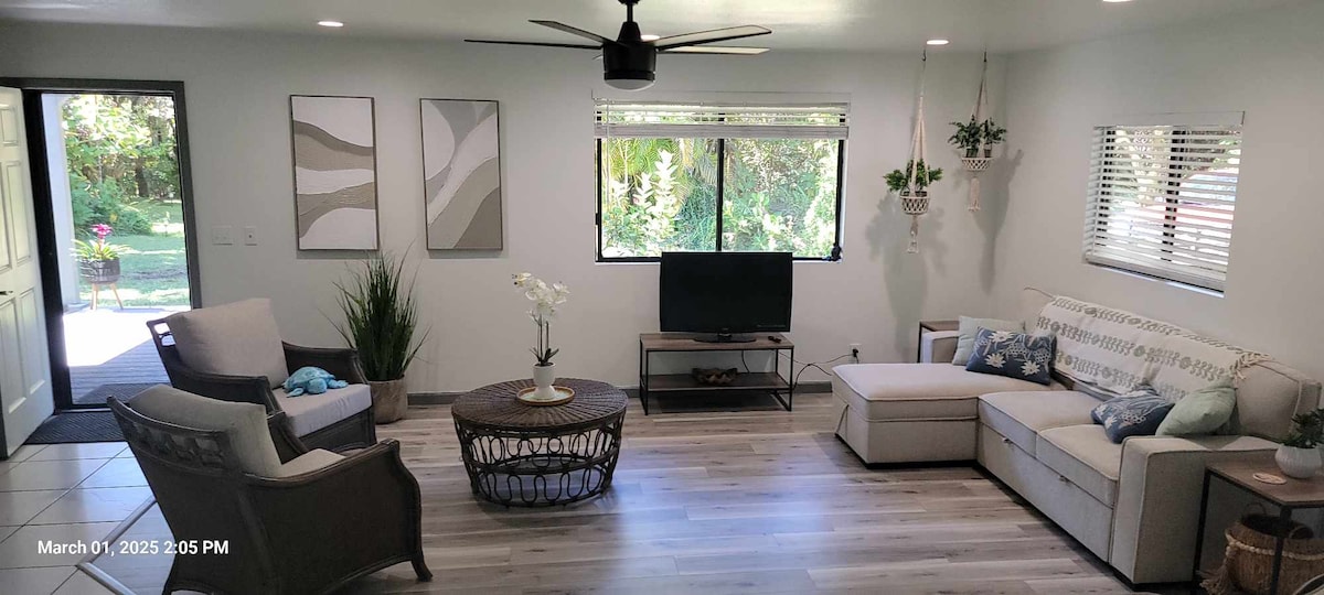 Relax with family and friends at this peaceful stay, located in the beautiful subdivision of Hawaiian Paradise Park. This newly renovated two bedroom, one bath home offers an affordable and relaxing stay with all of the comforts of home. This hale offers quick access to a secluded beach trail, the local hangout spot known as The Cliffs, and local farmers markets. Just a short drive to nearby Pāhoa, Keaʻau, or Hilo to explore all Puna has to offer.
