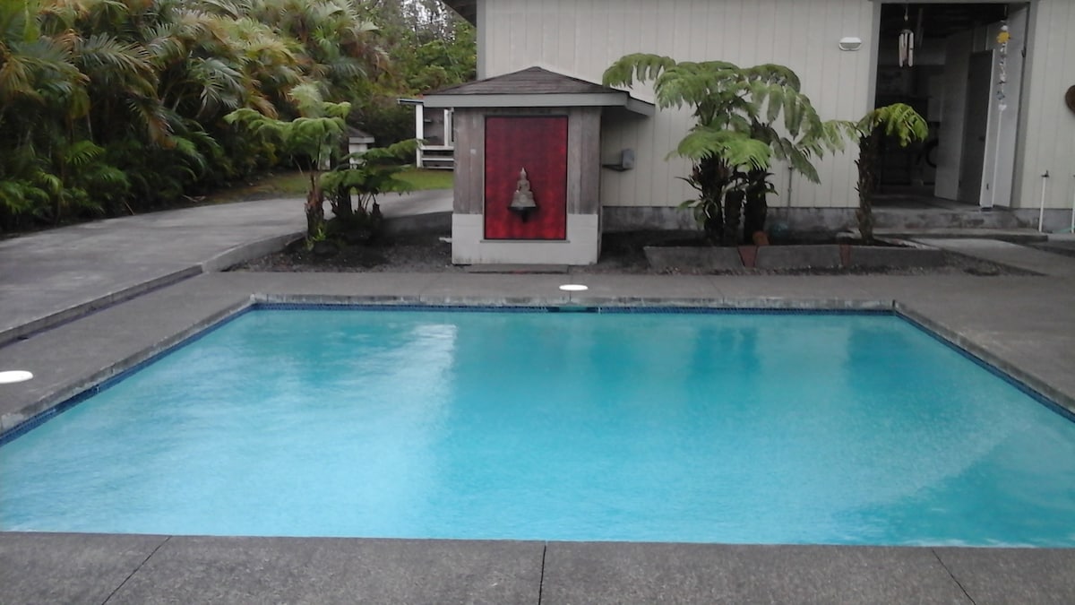 Large studio unit attached to our family home in HPP, a rural subdivision in Puna on Hawai‘i Island. 20 min from Hilo Int'l Airport & 40 min from Volcanoes NP. We have 2 large dogs, Jack & Boogie, a big blind pig, Lilo, and many cats. They bark/chuff and will be excited to meet you. If you aren't comfortable around large dogs and a blind pig this is not the place for you. Animal noises, incl. coqui frogs, are part of this rural space. You agree to all "House Rules" by instantly booking.