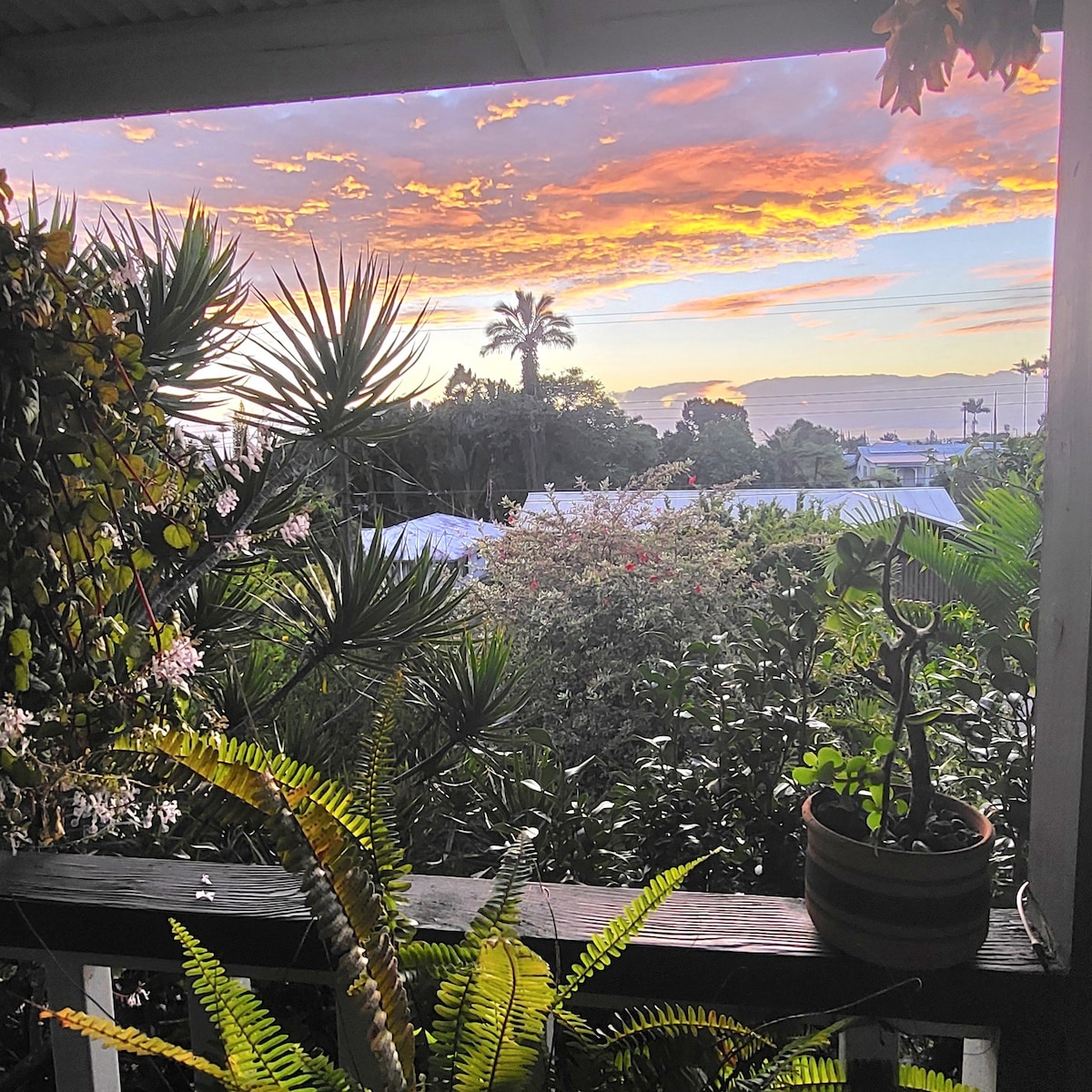 Enjoy our "Sunrise Suite" with bright, airy comforts. This fully renovated private apartment includes a new kitchen and bathroom. Located in the cooler hillside of Waiakea Uka, Hilo—close to the airport, downtown, and local attractions. A hosted stay in our home, ideal for travelers who value safety, local hospitality, and community connection. You’ll have a private entrance and space, with your hosts nearby. You may occasionally hear the gentle rhythm of daily life, including our friendly pets.