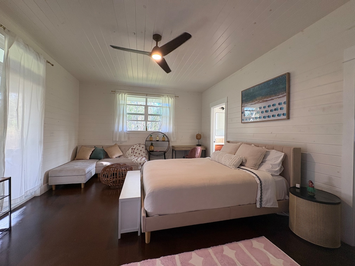 Open air Ohana, built off the lanai, located close to town making it easy to plan your visit. This ample space for two is located only four miles from the airport, seven minutes to the heart of downtown Hilo, Saddle road, Walmart, Safeway or the Hilo mall. Walk up the hill to the park, a safe area equip with a basketball court and playground, or not too far away venture to rainbow falls, boiling pots or Kaumana caves. A relaxing, breezy space allowing for a peaceful vacation or business travel