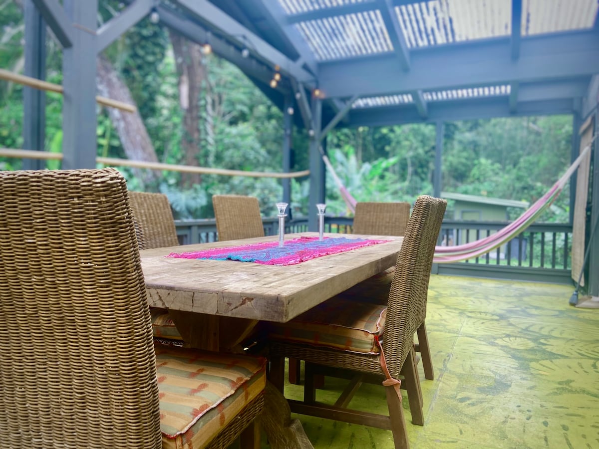 *Aloha Falls is heaven on Earth! You will find yourself nestled in the jungle with views of waterfall paradise, engulfed by bamboo and fragrant flowering trees with orchids nestled in their branches. Enjoy the space for a private retreat or invite your family and friends to fill the house. The entire home and property is filled with healing intentions that evoke peace and happiness. Inquire right away for a transformative spa retreat day and curated farm to table meal