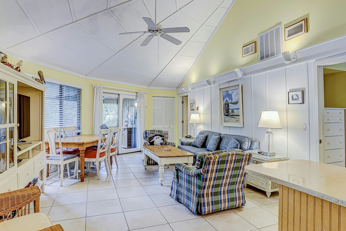 Gated Beach & Golf Resort! ✨ Top 10% Airbnb Guest Favorite ✨ Beach, Golf, Pool, Spa, Restaurants & Bars FREE Pickleball & Tennis – across the street HGTV Decorator designed Panoramic Golf & Lagoon Views! Big Porch Huge Old Oak trees! Coastal Décor Sunny 1st Floor End Unit KING BED + 2 QUEENS 3 XL SmartTVs FREE: FAST WIFI & CABLE Marble Kitchen Washer/Dryer Beach Cart, Chairs, Boogie Boards, Ice Chest BBQ Walk & Bike Path to Beach! Walk to Golf Club & Pub Close to Coligny Summer Beach Shuttle
