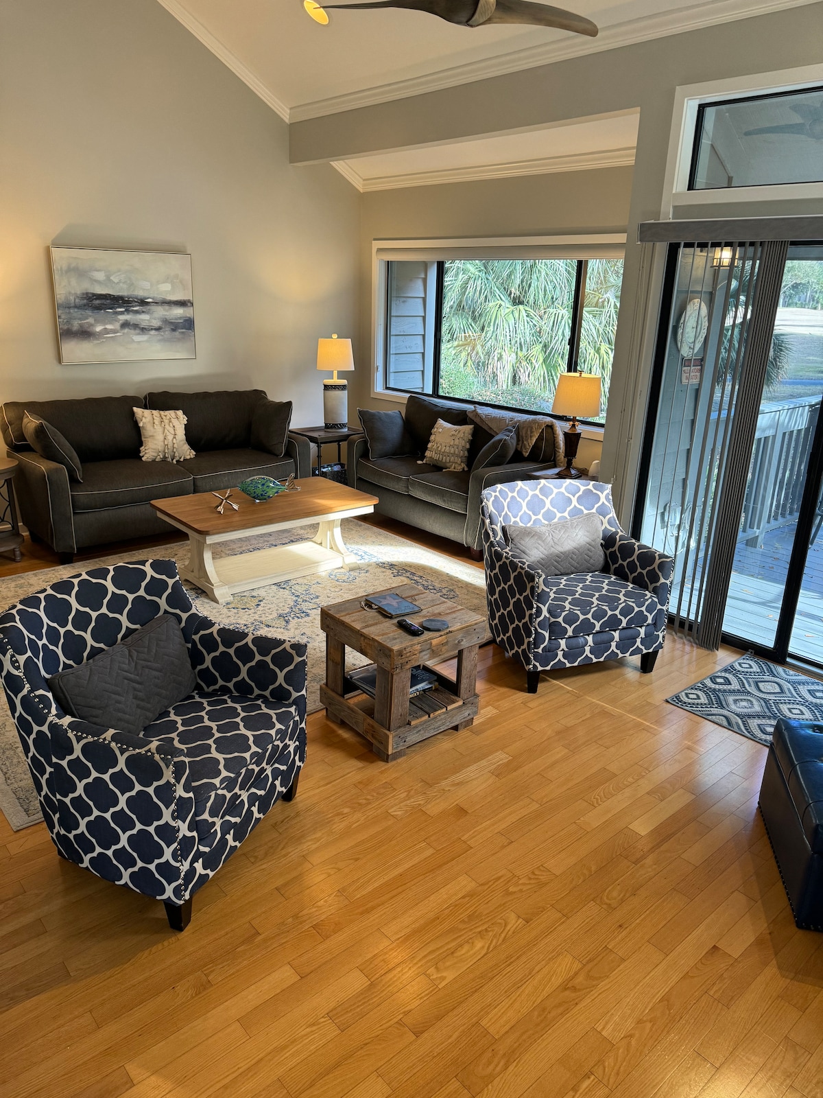 Gated Beach & Golf Resort! ✨Top 5% Airbnb Guest Favorite✨ Beach, Golf, Pool, Spa, Restaurants & Bars FREE Pickleball & Tennis – across the street HGTV Decorator designed Panoramic Golf & Lagoon Views! Big Porch Lush Landscape Tons of Wildlife Coastal Décor Sunny 1st Floor End Unit KING BED + 2 QUEENS 3 XL SmartTVs FAST WIFI & CABLE Chef's Kitchen Washer/Dryer Beach Cart, Chairs, Boogie Boards, Ice Chest BBQ Walk/Bike Path to Beach Walk to Golf Club & Pub Close to Coligny Summer Beach Shuttle