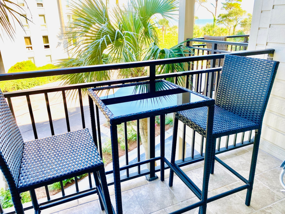 Just steps from the sand, this cozy coastal condo offers a private balcony with a side ocean view. A short walk to Coligny Plaza, a vibrant area with a variety of cute cafes, restaurants, and shops. The complex features a pool, sundeck, and community grill; bring your own charcoal. Fast High-speed internet, FREE WIFI, smart TVs, you're always connected. Enjoy the comforts of home with a fully stocked kitchen, a plush King bed, ideal for remote work, and modern updates & included amenities.