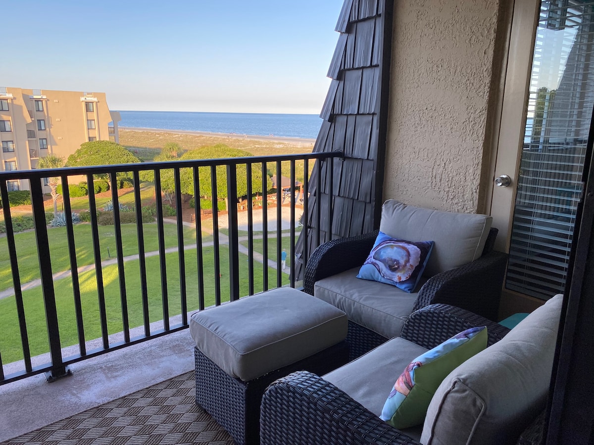 Our two bedroom ocean view villa will comfortably sleep 5-7. Our unit has an oversized balcony. The master suite includes a king size bed and master bath. The guest room includes two full size beds with its own bath. The Island Club maintains gas grills from a picnic area. The Island Club has nine free tennis courts, a large heated pool with a children's pool, a tanning pool, fitness center, hot tub, basketball, and bike rentals. Check out our condo's reviews at VRBO 513502.