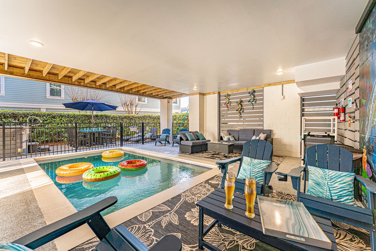 Discover the perfect getaway!! FUN for the whole family at this stylish beach house near historic Mitchelville Beach: •Private heated pool with slide & covered hot tub •Walking distance to Mitchelville/Fish Haul Beach (free parking & restrooms) and two public field parks •4 balconies, 3 daybed swings, large hammock •2 king, 5 queen, 2 full •Guests love the upstairs loft and bunk room with generously sized beds & individual charging stations •Ping pong table, Wii, toys, games, puzzles, books