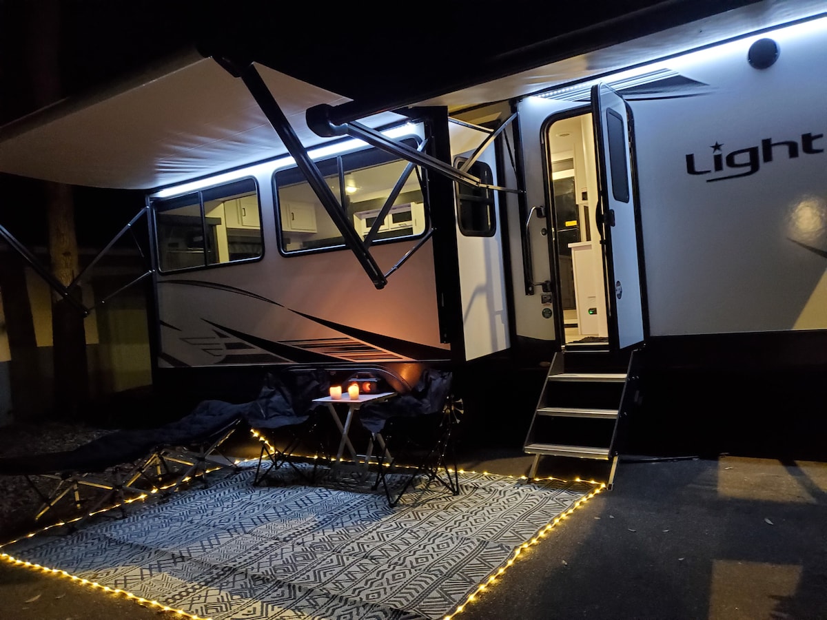 Peacefull and private. The RV is a 2017 38ft motorhome. It is parked next to a 1/2 acre pond with fish, ducks, ospreys, egrets, lots of other wildlife. You have your own porch over the pond. There are walking trails. It's located about 3 miles from downtown Bluffton and about 5 miles from Hilton Head Is. Full sized fridge, and full kitchen. There is a large awning. There are also horses, goats, pigs, ducks, chickens, ferrets, baby racoons and squerrals.