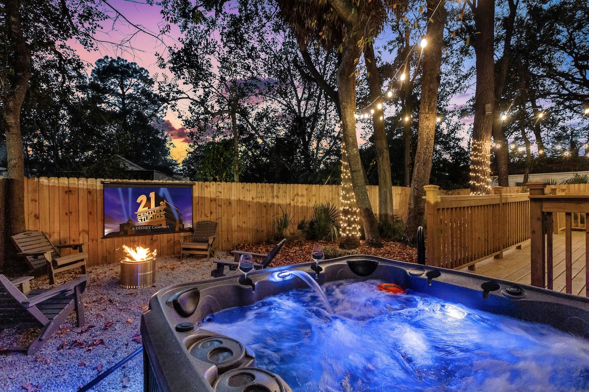 Welcome to your Lowcountry retreat! This family-friendly home comfortably sleeps up to 9 adults, offering a perfect blend of relaxation and entertainment for all => Hot Tub => Fire pit => Movie Screen => Yard Games => Pet friendly* => 4 bikes, 2 scooters => 2 Paddle boards => Luxe outdoor living => Walk to old town => 3 bd, 2.5 bath => 2 king, queen over queen, 1 Twin => Great for families => Palmetto Bluff luxury w/o the price => Screened in pergola (pics soon) => 5 star bedding high end linens