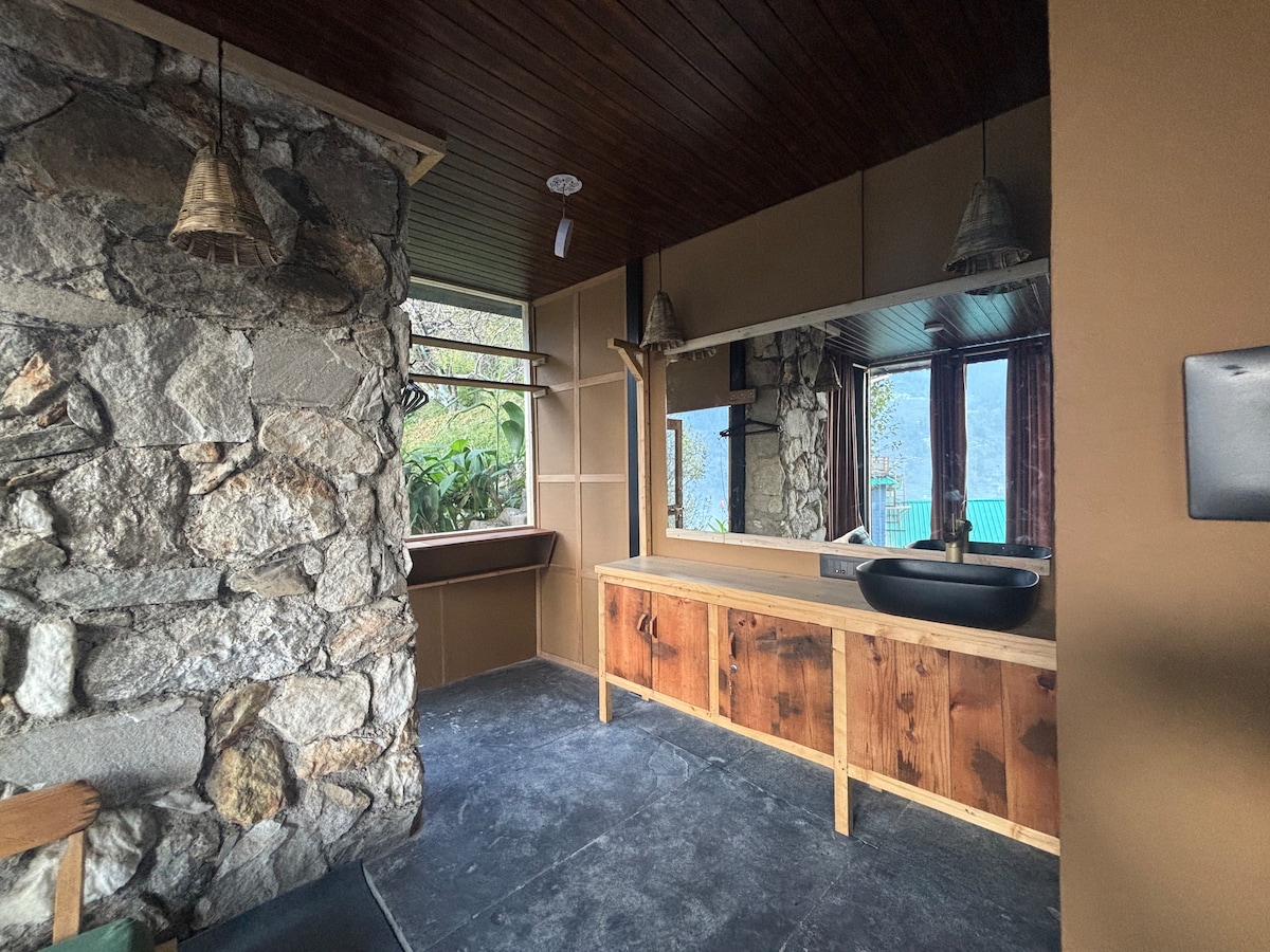 Glamoreo, just 1 hour away from Shimla. Stunning walnut wood interior, including all the furniture. Outdoor wooden bathtub, perfect for soaking in the fresh mountain air. The surrounding area is open and spacious. You can walk around, take in the scenic views, and get a feel for rural life. Everything here is organic, from food to dairy products. If you don’t feel like home-cooked meals, there are cafes and restaurants just 3–4 km away, and you can either visit them or have food delivered
