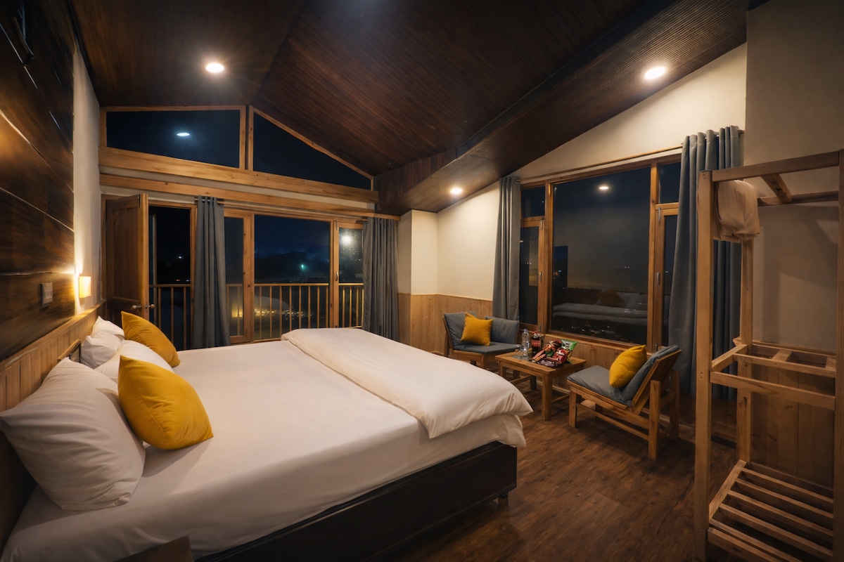 Super cozy Duplex Suite WITH WINDOWS for mountain view. One bedroom on lower level with one washroom and a wooden stairs to upper level bedroom. it has a sofa set on upper level where 4-5 guest can sit and enjoy food. ROOM INCLUSIONS : -Comp Mineral water on arrival -Free WI-FI , parking Free Breakfast (Morning 8.30 till 10.30am)served at dining area only (No Room Service) -Heater at additional 300/- rs charge Room is on 3rd Floor Note *No provision of lift*
