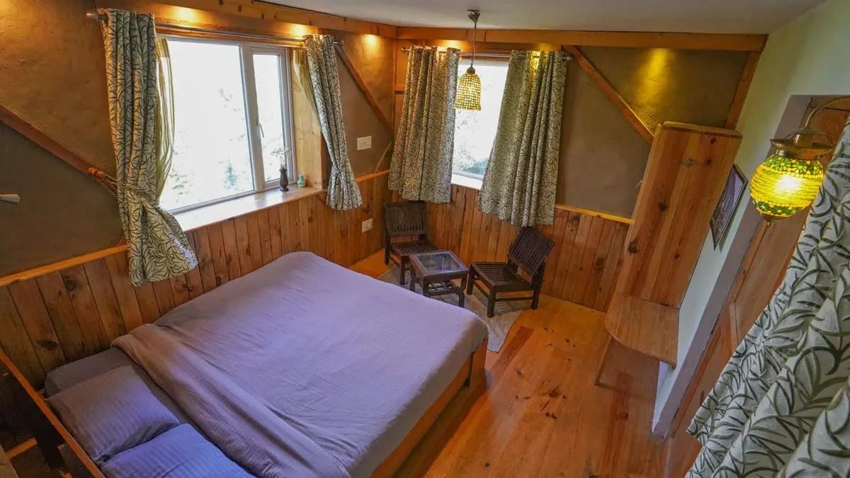 This duplex at “Nirvana Trueliving” accommodates 4 adults, featuring a king-size bed on the ground floor and a queen-size bed in the attic. It’s a single-room space with two open levels, without separate locking doors. Perfect for work-from-home, families, friends, or adventure seekers — whether you wish to explore, unwind in the garden with a book, or simply embrace nature’s simplicity offers it all. And yes, you’ll also get to meet our friendly pet, Rossi, who calls this home too! 🐾