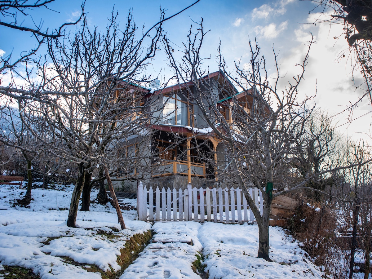 A true-blue working Apple orchard, barely 400 meters from the iconic & world-famous NAGGAR CASTLE, in a quaint little village called Chanalti. It is a rustic village set-up but fitted with all modern-day comforts - along with unending cups of herbal tea, coffee & stories to share! It is a place where the air is always fresh, the views are always stunning, and our hospitality is always homely, warm and welcoming! Min 2 Night Stay required! Pls. DO NOT book for 1 Night. STAGS NOT ALLOWED 🚫