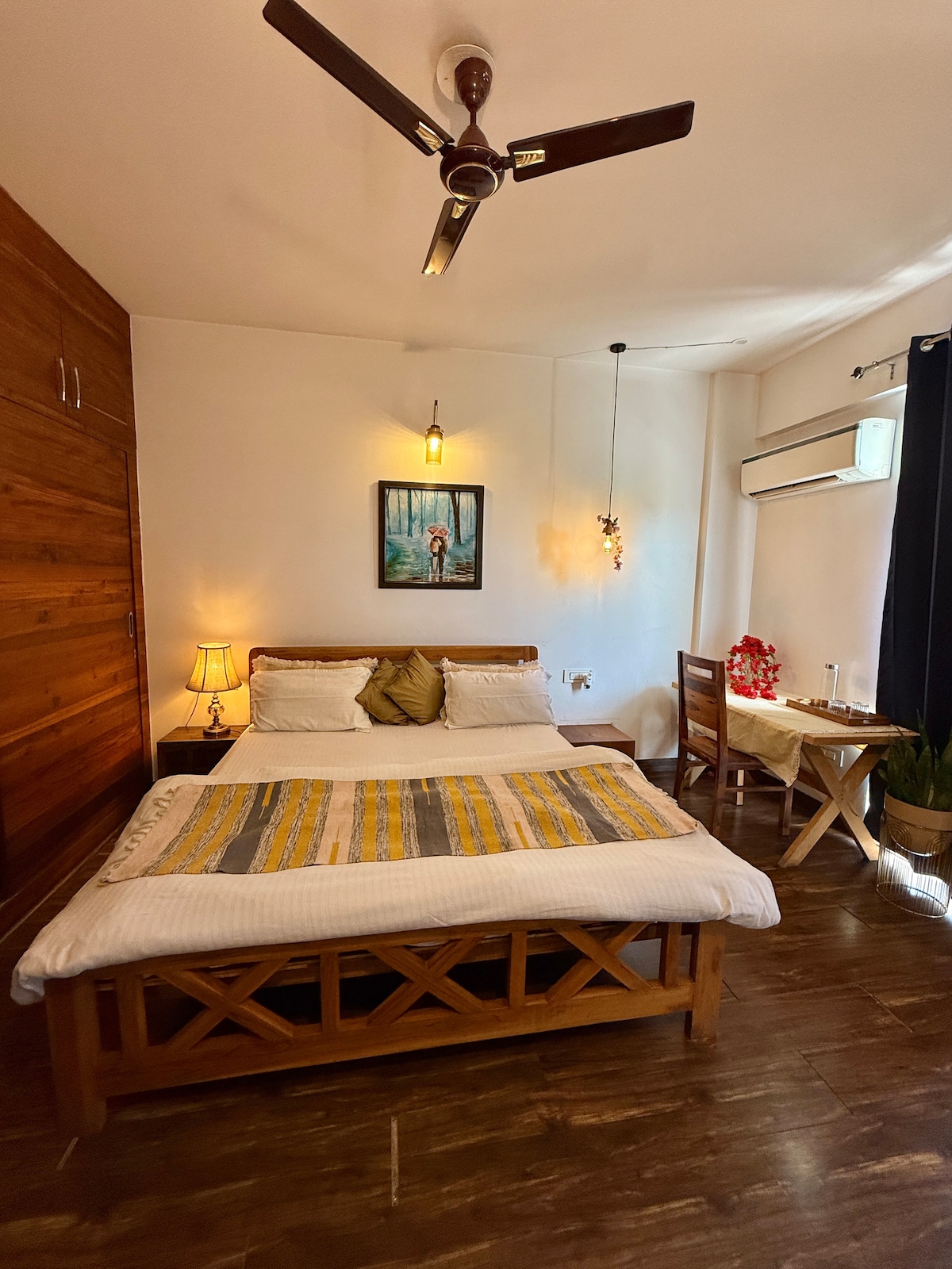I live in Silicon Valley, California and built this as a 2nd home in India. It's located in the foothills of Himalayas at 2000 meters and is designed for lovers of nature that work in tech/online. The house has everything you need to be comfortable including a spacious bedroom, a great kitchen, bathroom and wood fire sauna. The downstairs veranda has day bed and a cozy tandoor corner while the veranda upstairs off the bedroom is a great place to watch sunrise along with morning chai.