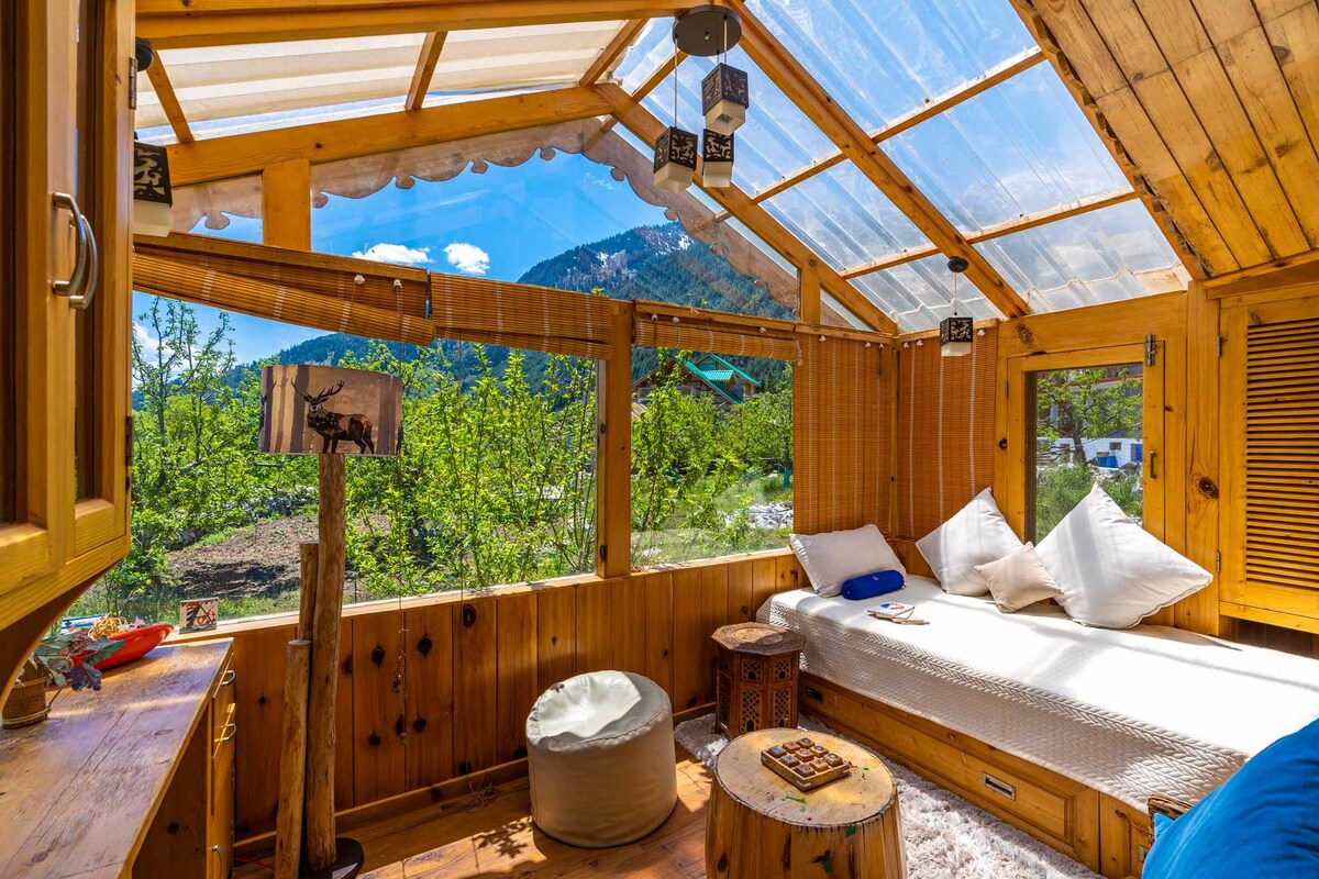 Experience the perfect blend of nature and opulence, perched atop Tandi hill near Jibhi. Delight in a luxurious soak in a hot bubble bath while relishing breathtaking views directly from your bathtub. Nestled away from road and traffic noise, the only sounds you'll encounter are the melodic chirping of birds. With an all-glass cabin, you might even spot a flying squirrel or catch a glimpse of a shooting star in serene night sky. Unwind and enjoy the tranquility of this chic, peaceful retreat.