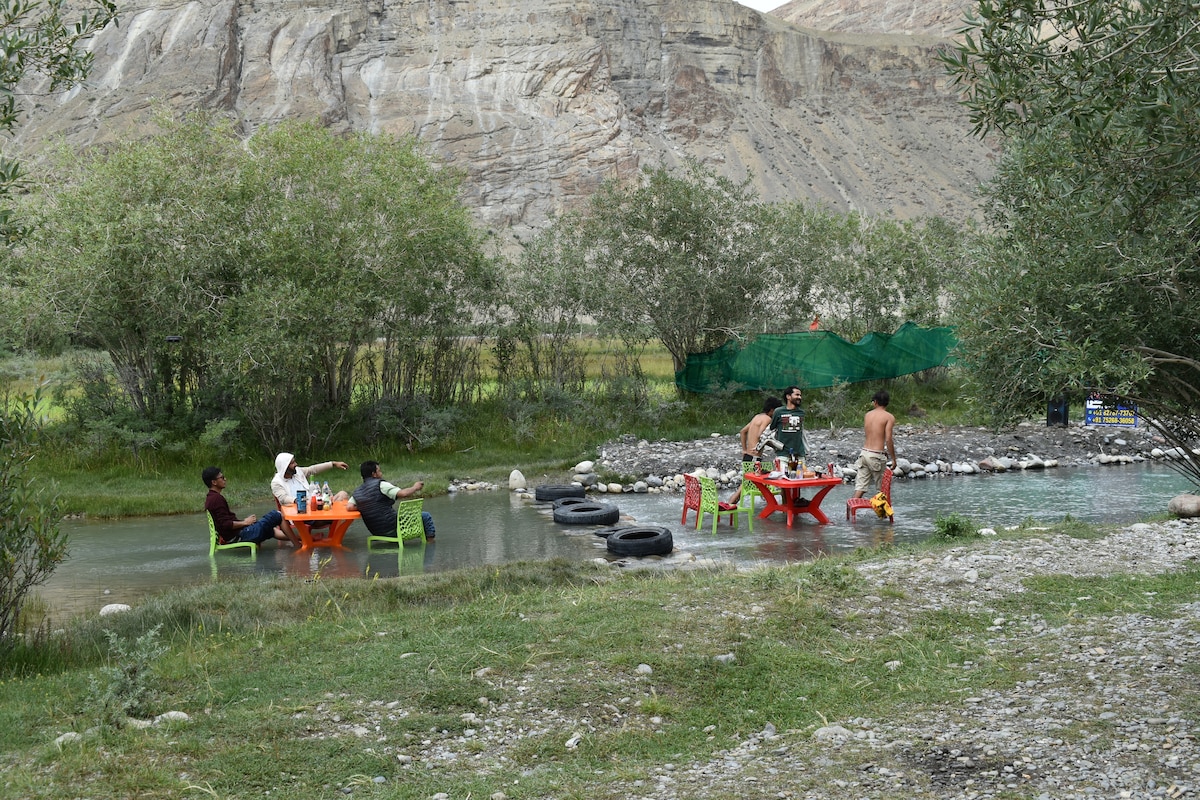 🏕️ Riverside Camping in Jispa 📍 Location: • 5 mins from Jispa village • On the banks of the Bhaga • Direct access from Manali–Leh highway 🛖 Accommodation: • Spacious canvas tents (up to 4 guests/tent) • Beds with clean blankets & mattresses • Charging points • attached washroom & hot water on demand