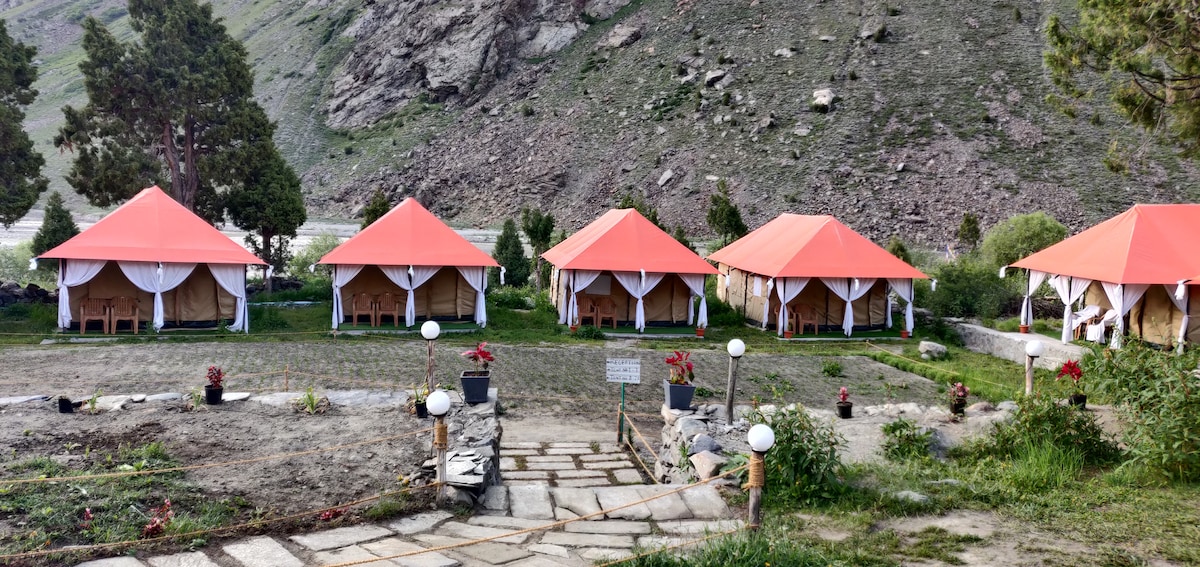 Luxury Camps in Raison: Wake up to epic Himalayan views, unwind under a canopy of stars, & relax in style. ️ 10 spacious tents w/ comfy beds & modern bathrooms. Adventure awaits: paragliding, rafting, & hidden gem exploration. Cozy bonfires, personalized service, & epic mountain memories. Escape the ordinary. Book your unforgettable glamping adventure today!