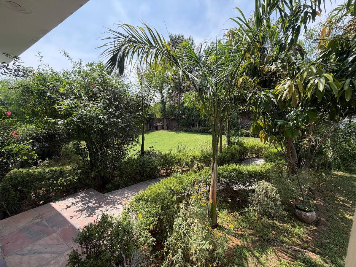 Designed as an ode to my parents (Mom: Krishna and Dad: Rajendra), KrishRaj farms was crafted for relaxation, and reconnecting with nature. 5 acres of beautiful greens, lawns, fruit orchards, fish pond, flora and fauna, and a pvt. outhouse. A private sanctuary to disconnect and unwind, at the foothills of the Aravallis; surrounded by serene village fields on three sides. This tranquil atmosphere and accessibility on the popular Leopard Trail next to the city, makes it a sought-after destination.