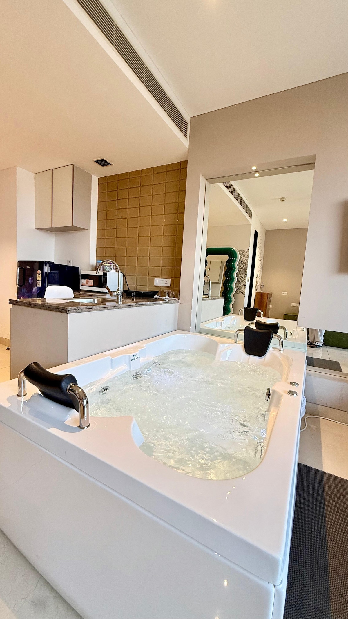 Luxe Heaven Heights 12th Patio 2 stands out with its private 2-seater jacuzzi, stunning high-rise city views, and modern architecture. The big wall mirror adds elegance, while the spa-like bathroom ensures luxury. Guests enjoy a pool, gym, high-speed WiFi, big-screen TV, and 24x7 security & parking. The fully equipped kitchen makes home-cooked meals easy. Located in Gurgaon’s prime area, it’s super safe for women and offers exclusive private access!