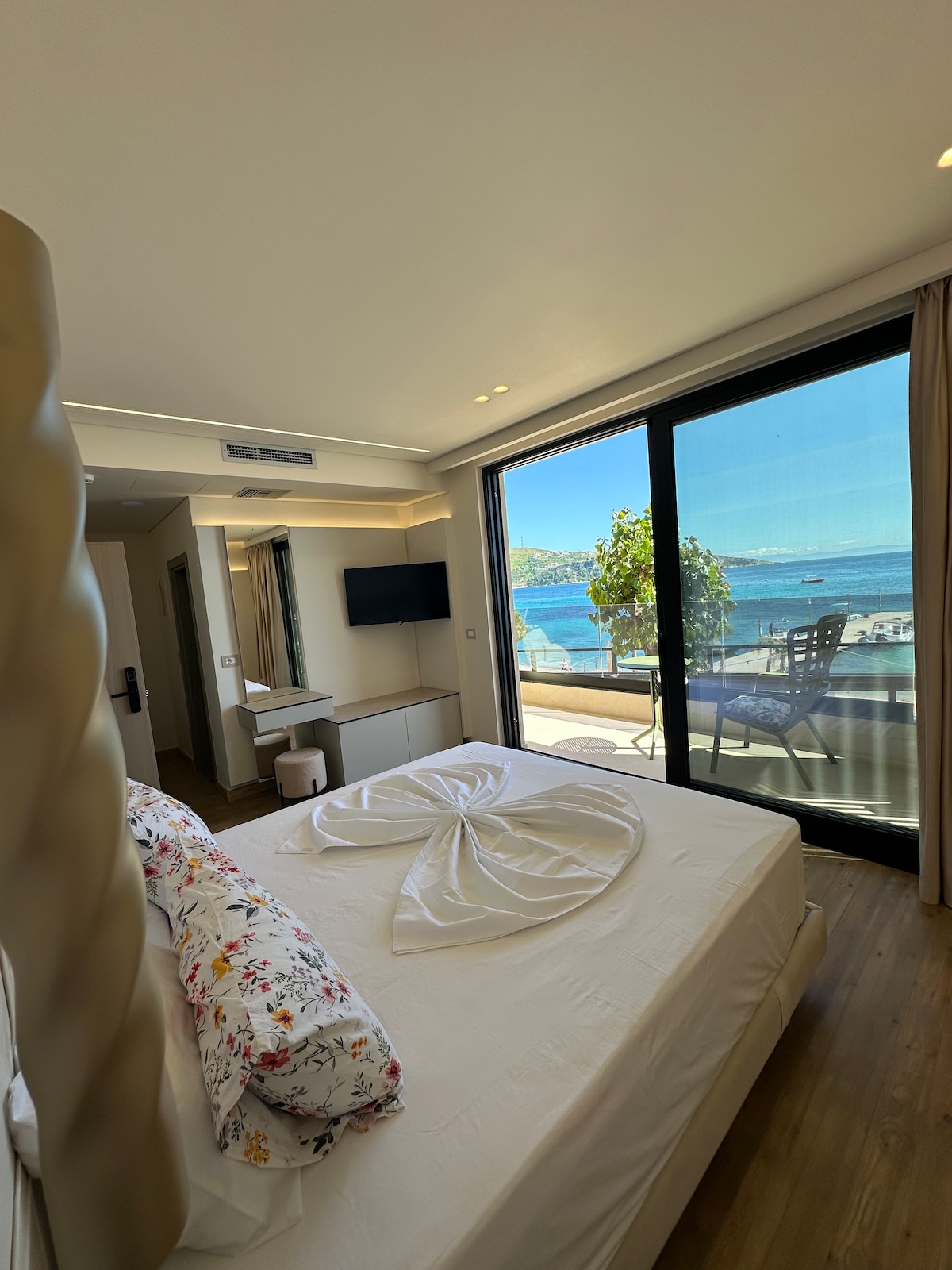 Beachfront Room with Side Seaview Located just a few steps from Sarandë’s best beaches, this charming beachfront room offers a serene escape with a beautiful side seaview of the Ionian Sea. Enjoy the calming breeze from your private balcony, unwind in comfort with modern amenities, and take advantage of being just moments away from the city’s vibrant coast. Perfect for those looking to relax by the sea while exploring the heart of Sarandë.