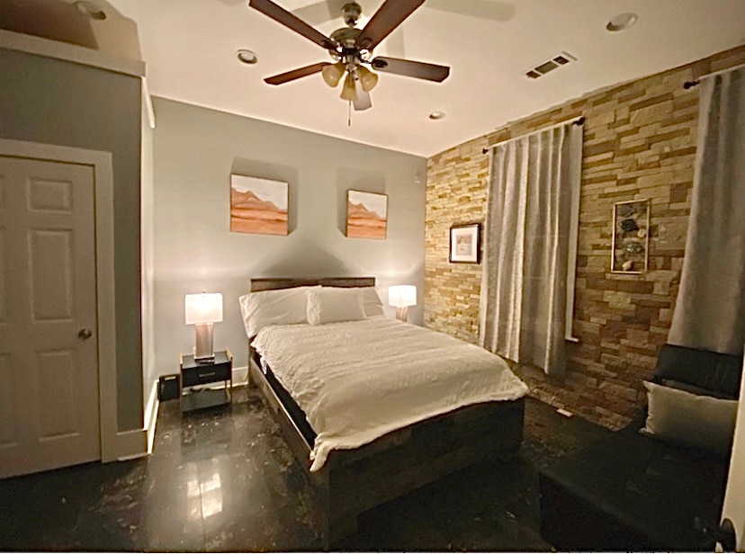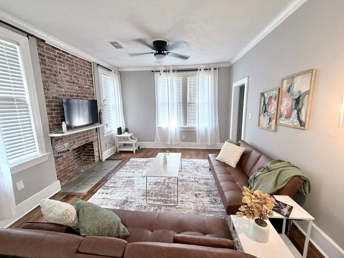 Enjoy a stylish experience at this centrally-located place. Close to many restaurants, shopping, interstate and hospitals. Walking distance to park. This 3 bedroom 2 bath home has been remodeled throughout. All new appliances including washer and dryer. Kitchen is stocked with a Keurig coffee maker and a triple use micro-wave, air fryer and convection oven. Smart TV's in all bedrooms and living room, with a cabinet thats has an fireplace, that creates a soothing ambiance along with heat.
